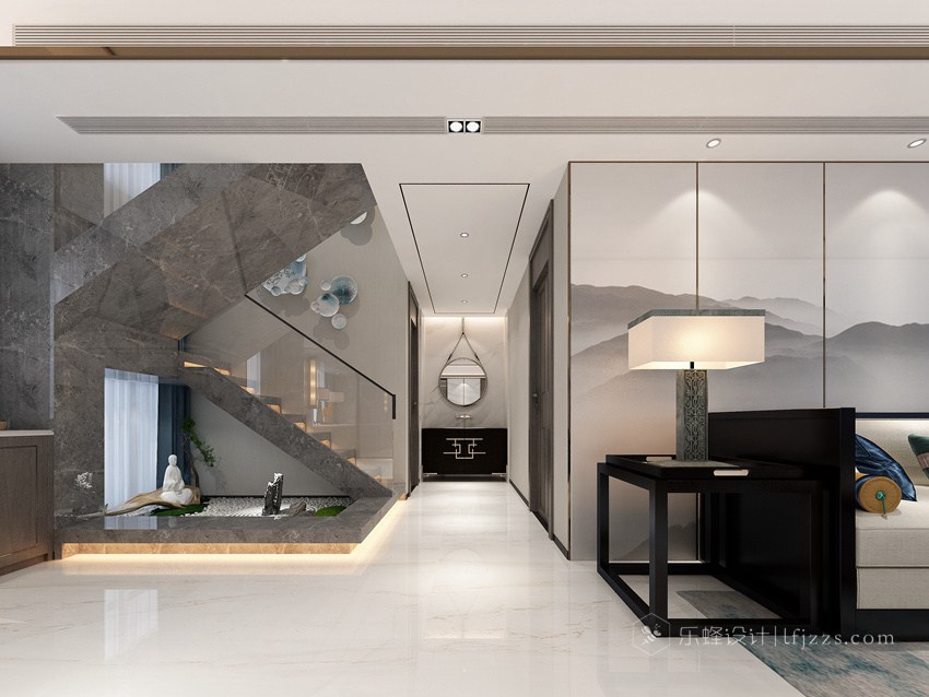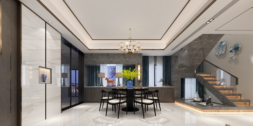 該案例位于龍崗市中心的華策中心城,小區(qū)分布以多層復(fù)式為主,本案為二樓的一套復(fù)式。屋主為潮汕地區(qū)業(yè)主,對(duì)中式比較情有獨(dú)鐘,但是又怕中式的儀式感太強(qiáng),色彩過(guò)于沉重。了解到客戶的這一需求后,設(shè)計(jì)師將現(xiàn)代風(fēng)格的手法和中式的元素相結(jié)合,配色方面以淺色系為主,搭配中式元素做點(diǎn)綴,現(xiàn)代中透露出淡淡的中式味道,作為裝飾用的頂部不銹鋼線條,更是增加了整個(gè)案子空間的線條感,讓整個(gè)空間更加生動(dòng)活躍。
