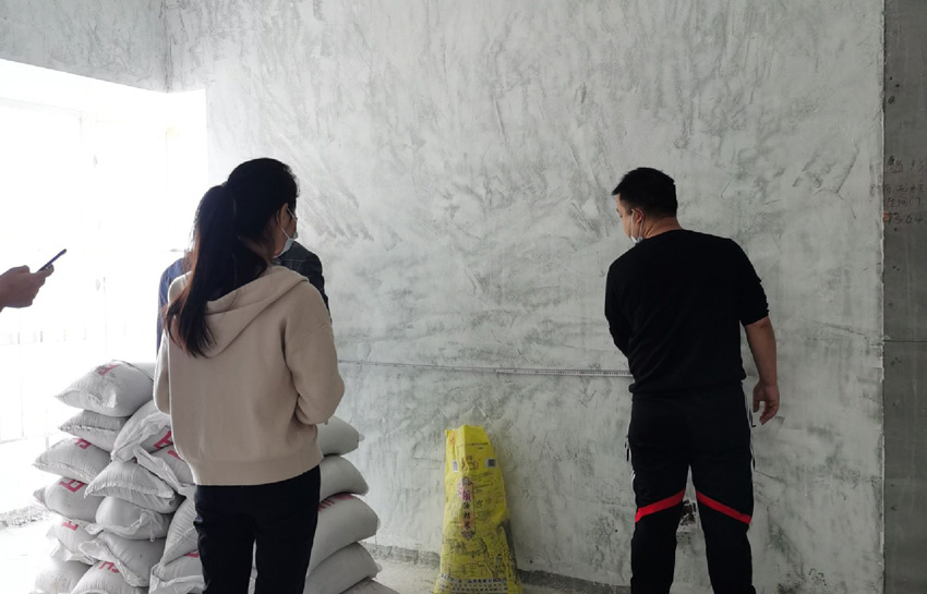 墻面批灰,第一遍用外墻膩子,同時掛纖維網(wǎng)。施工工藝:①天花接縫處及水電開槽處做防開裂處理。②全房墻面掛纖維網(wǎng),防止膩子層開裂,埃特板造型釘眼處做防銹處理。③貼陰陽角條。