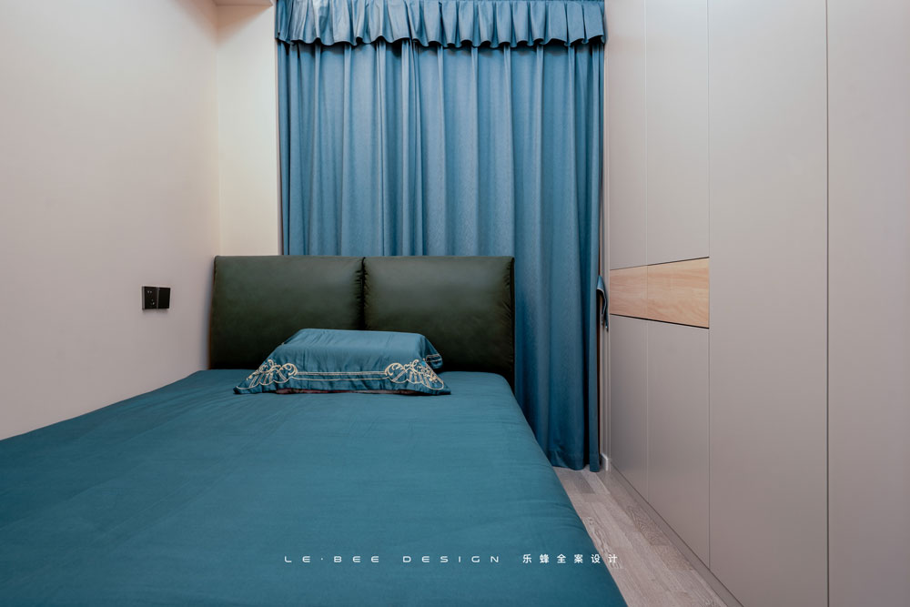 次臥室主要是長輩在這里休息,在門后的空間我們定制了整排的衣柜來增加換季的儲(chǔ)物空間,同時(shí)充分發(fā)揮次臥室的進(jìn)深放下床的同時(shí)留下過道方便進(jìn)出陽臺。