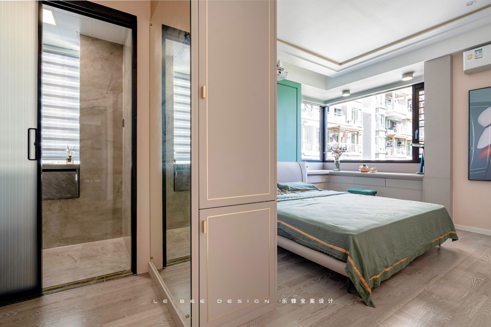 推開主臥的門,映入眼簾的是一個(gè)比較有儀式感的衣帽間,主臥在空間有限的情況下盡可能滿足屋主的需求,在主臥的布局上設(shè)計(jì)了衣帽間、全身的試衣鏡,同時(shí)在側(cè)面也能開啟的設(shè)計(jì)充分利用來了儲(chǔ)物空間,更加具有創(chuàng)意。