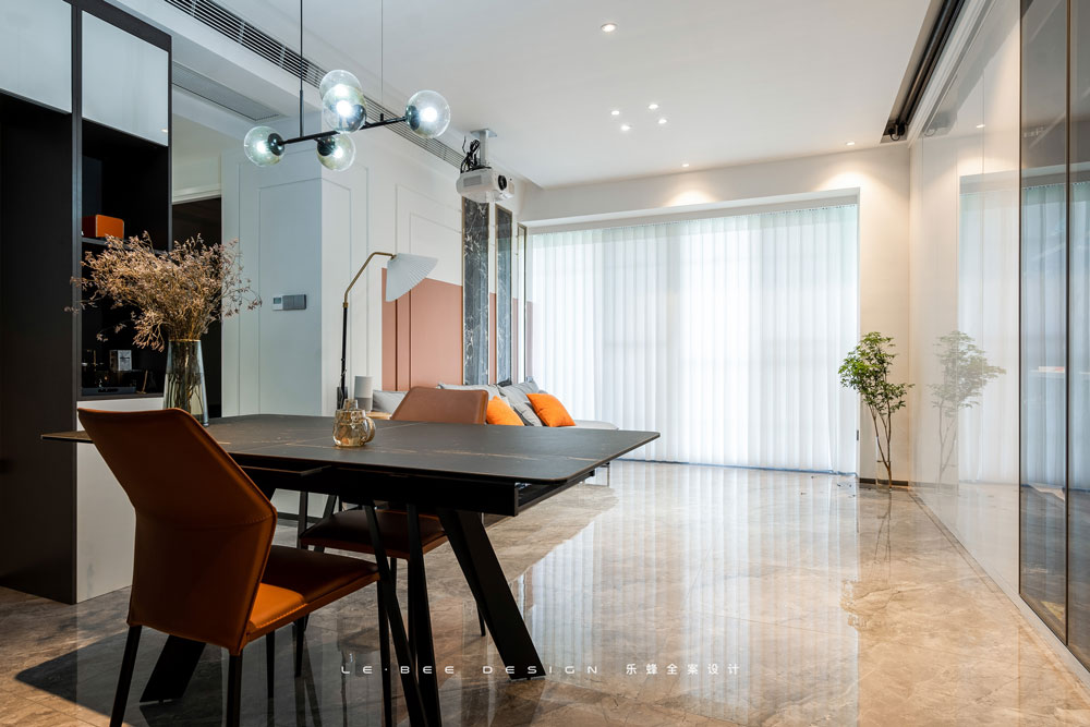 客廳格局目光所及之處皆為方正之勢,餐廳在得到了更多采光的補(bǔ)充之后,只需要吊燈和上方的防眩筒燈的重點(diǎn)照明來點(diǎn)亮餐桌即可,黑色的巖板餐桌在溫潤的燈光之下展現(xiàn)出黑金般的高級感。
