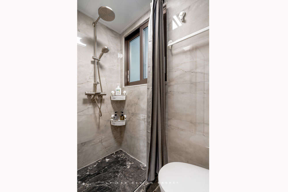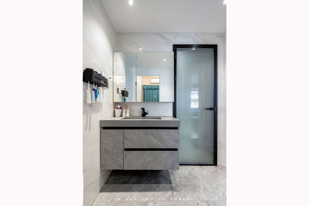 相比于主臥衛(wèi)生間的布局,公區(qū)衛(wèi)生間也更體現(xiàn)了空間利用的極致性,在臺盆外置的前提下,馬桶區(qū)和淋浴區(qū)隔而不斷,在中間設(shè)計(jì)浴簾,在有效阻擋水花外濺的同時(shí)保存了兩邊區(qū)域的空間感。