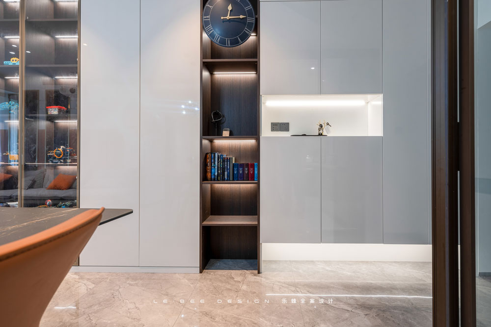 從入戶開始,鞋柜延伸到餐廳這邊的餐邊柜再到客廳作為儲(chǔ)物柜使用,充分整合了多種儲(chǔ)物空間,且看不到柜子側(cè)面也就沒有了空間的占用感,客餐廳這邊的柜門全部采用一門到頂?shù)脑O(shè)計(jì),視覺上拉高了整個(gè)空間的層高,即使是客餐廳和玄關(guān)做了無主燈的全覆蓋吊頂,也沒有絲毫的壓抑感。