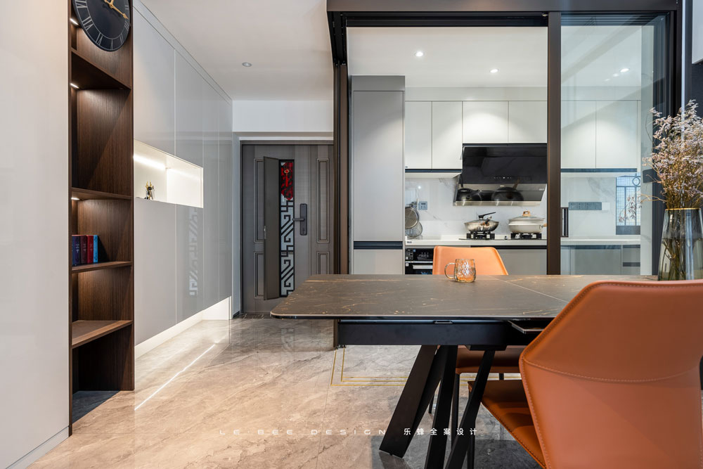 多聯(lián)動(dòng)推拉門讓餐廳和廚房在日常和做飯情況下能夠隨意切換,不同于傳統(tǒng)的地軌,這里采用了上吊柜加底部銅條的方式讓地面沒有厚重的軌道,日常清潔更加便捷,外置冰箱到餐廳這里之后廚房的空間被釋放開來,有更充足的空間來布置櫥柜。