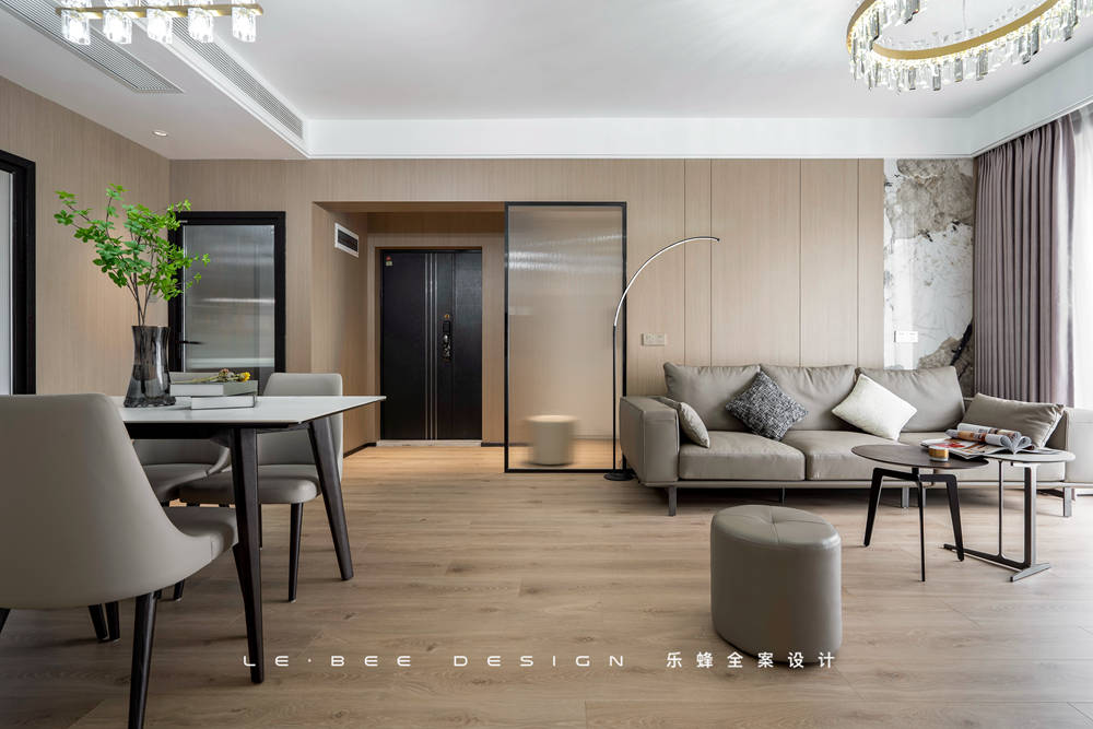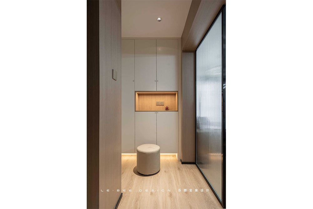 顏色選擇了業(yè)主一家最愛的淺色系,淺色木質(zhì)紋理有金色絲綢質(zhì)感,當(dāng)然功不可沒的是玄關(guān)處的暖色燈光烘托。在吊柜和地軌的兩處燈帶照耀下,玄關(guān)變得暖盈盈的,借此也為整個(gè)家的基調(diào)做了鋪墊。