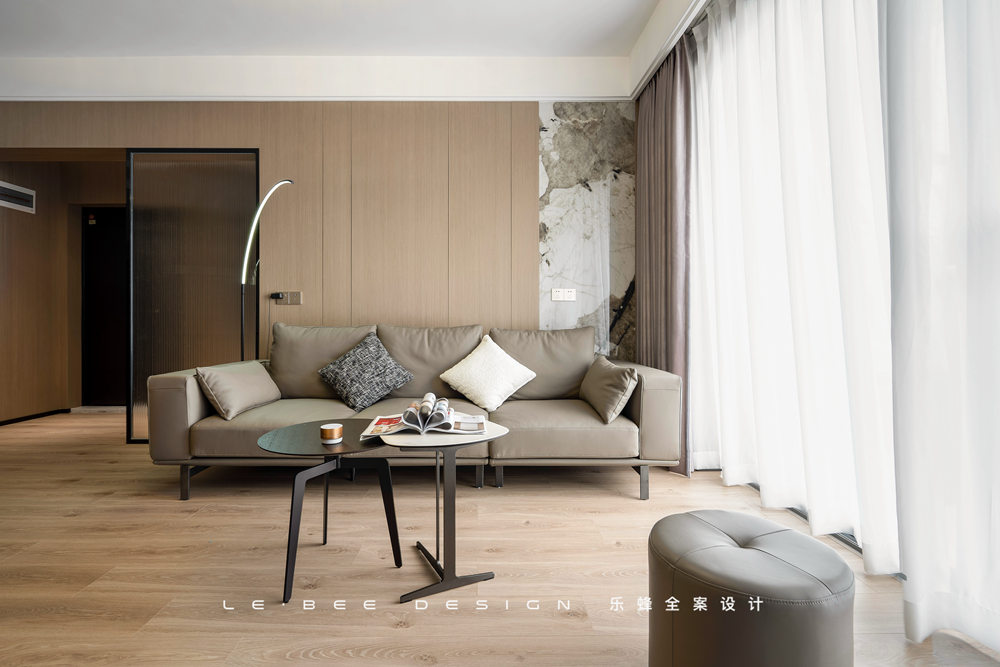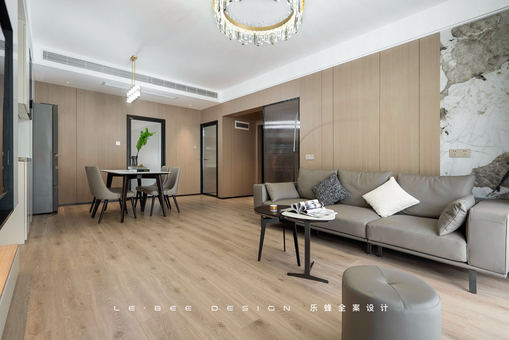 地面選擇暖色地板通鋪,在陽光照耀下反射瑩瑩微光。沙發(fā)背景選擇木飾面板,沒有刻意去掉拼接痕跡,增加了平面的線條和紋路,細(xì)小的紋路也能有跌宕的起伏。除此之外,沙發(fā)背景添加了一塊巖板進(jìn)行拼接,風(fēng)格迥異的材質(zhì)之間也能產(chǎn)生和諧之美。