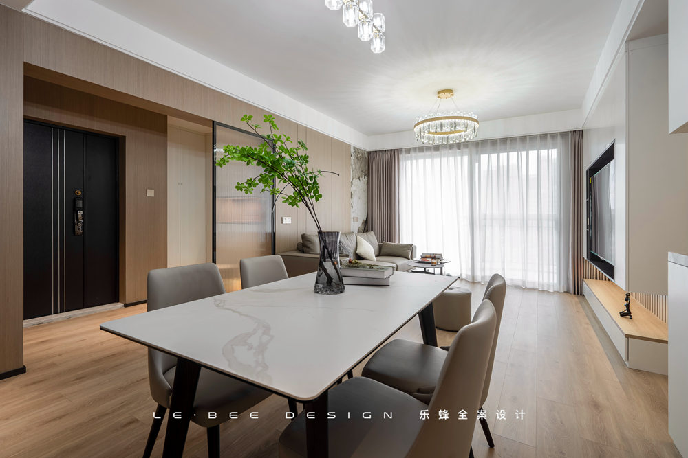 簡(jiǎn)單填充功能便丟失了家的藝術(shù),餐廳向來和客廳是相輔相成的存在。在格局上,一面餐邊柜加餐桌,整個(gè)餐廳顯得豐富又自在。足夠的空間設(shè)計(jì)回字型動(dòng)線,更適合活潑的孩子們四處走動(dòng)。