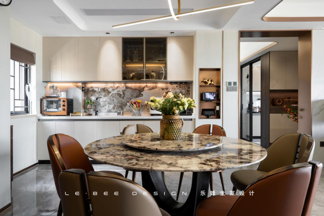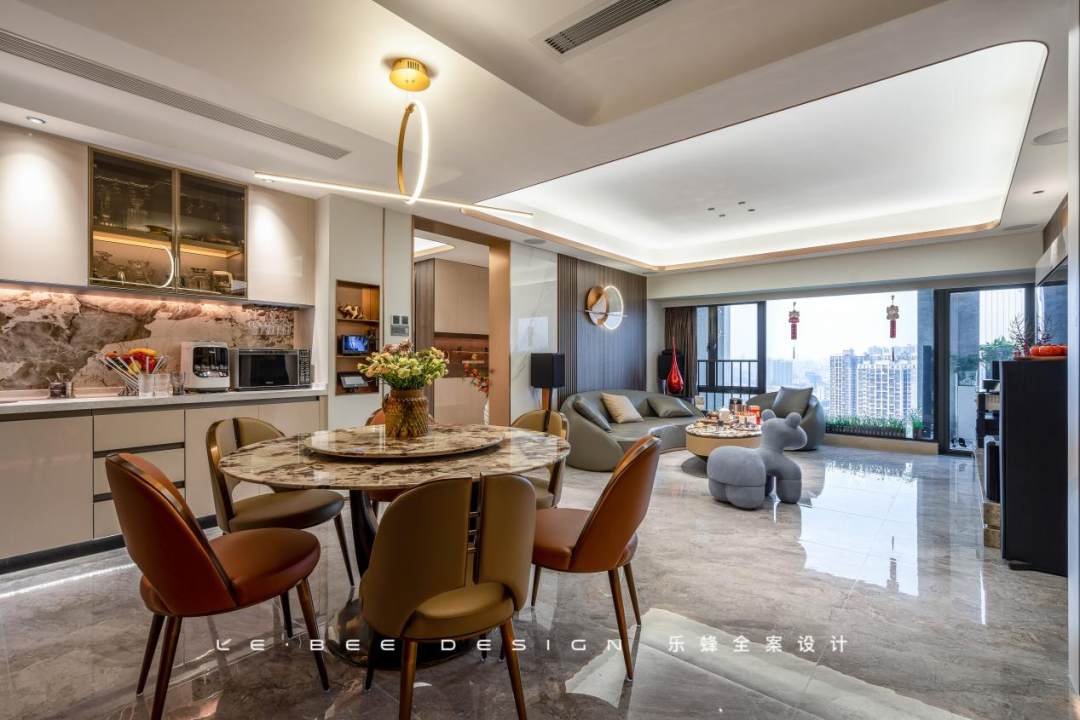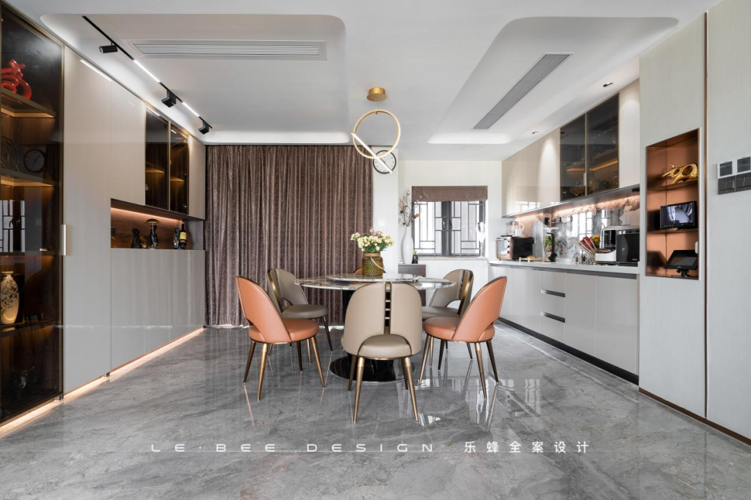本案業(yè)主初次了解我們是在一次家裝節(jié),互相留下聯(lián)系方式后半年再次聯(lián)系了我們,因?yàn)樵诹糠亢妥龇桨干系姆e極態(tài)度,加之我們獨(dú)有的粵派精工,業(yè)主對(duì)我們抱有好感和信任,因此達(dá)成了合作。對(duì)于新家的要求,業(yè)主希望能夠保留四個(gè)房間,讓每個(gè)家庭成員都有獨(dú)立的空間。對(duì)于家庭成員眾多且喜歡聚餐的業(yè)主一家來說,一個(gè)舒適寬闊的餐廳尤其重要,因此我們對(duì)餐廳和廚房部分進(jìn)行了重點(diǎn)改造。盡管改動(dòng)面臨著問題和困難,但經(jīng)過精巧的設(shè)計(jì),問題都統(tǒng)統(tǒng)解決,最終也成就了一個(gè)南北通透的公共空間。
