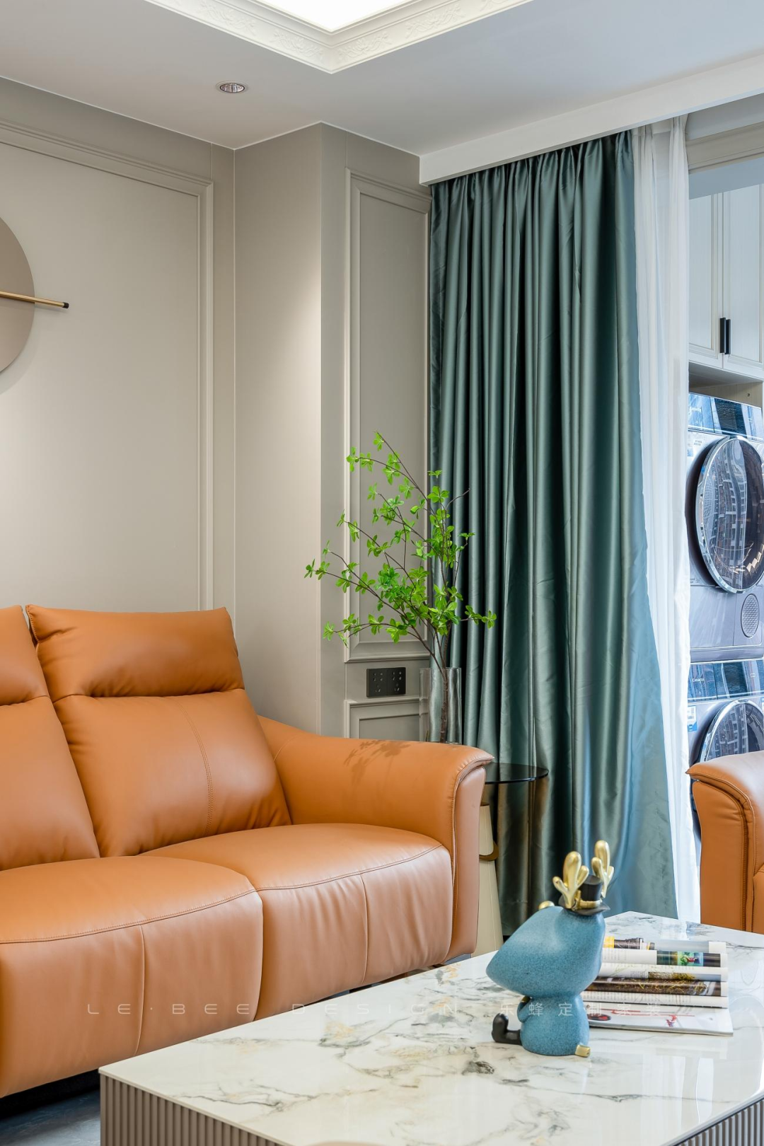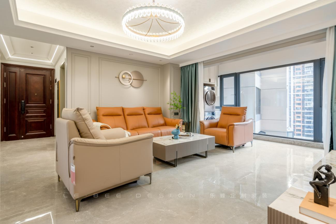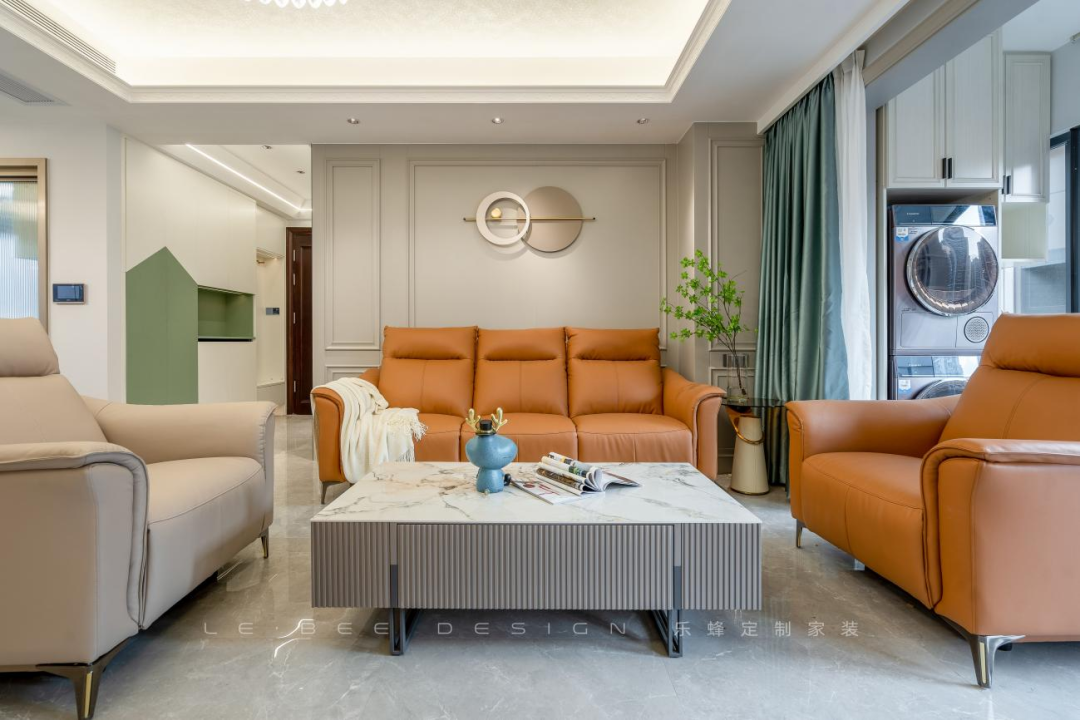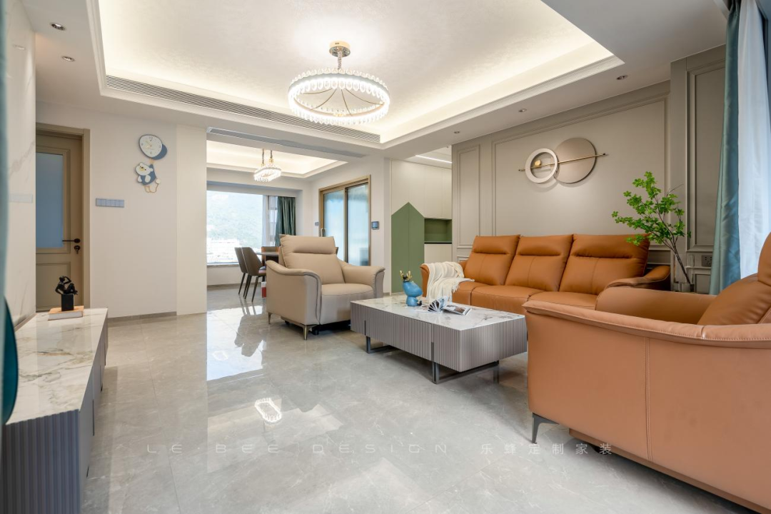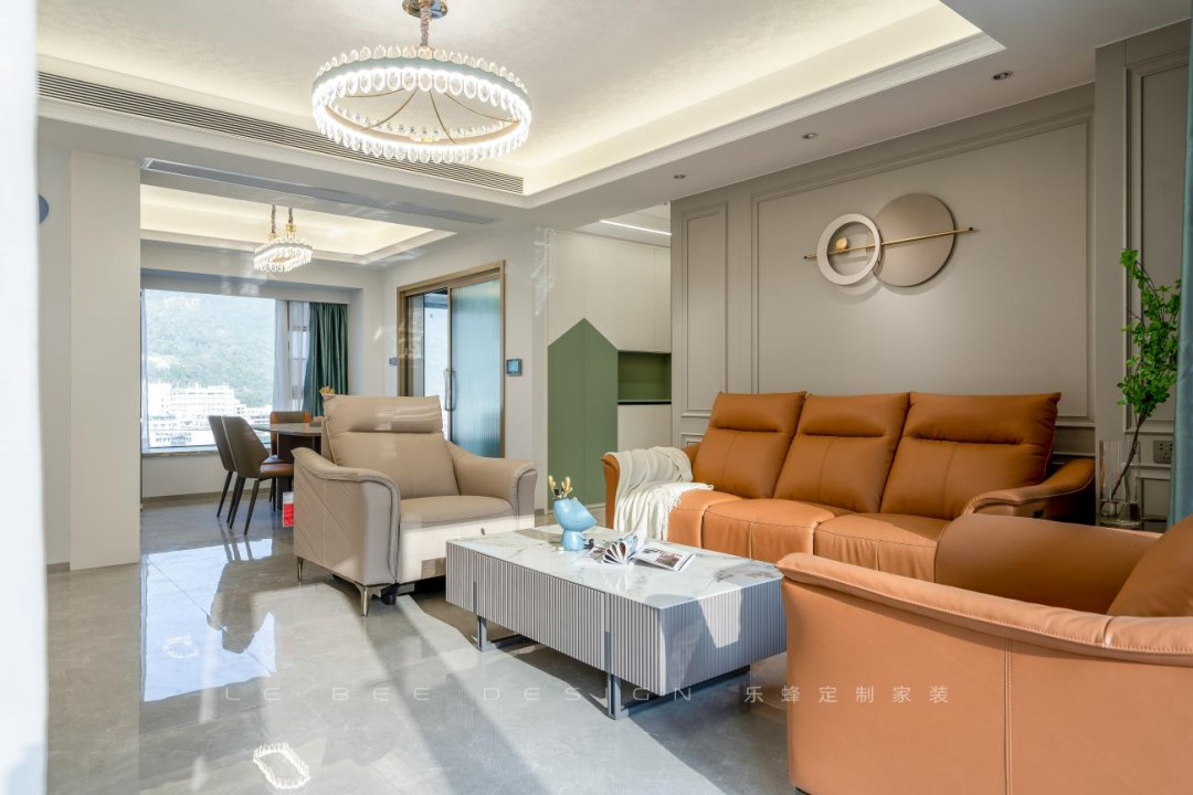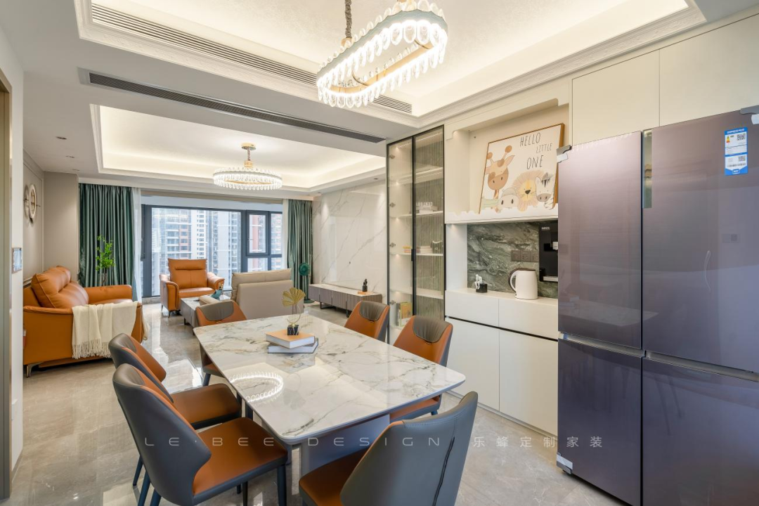 沙發(fā)選擇活力陽(yáng)光的焦糖色,真皮材質(zhì),造型立體,對(duì)于塑造精致的輕奢氛圍非常加分。餐邊柜的設(shè)計(jì)溫馨精致,長(zhǎng)虹玻璃作為酒柜玻璃門,耀眼通透。餐邊柜中部設(shè)計(jì)水吧臺(tái),方便家人平日的用水需求。冰箱外移節(jié)省了廚房?jī)?nèi)部的空間。
