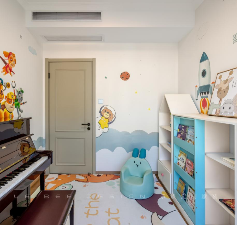 特地作為孩子的休閑娛樂(lè)區(qū),墻面選擇了孩子喜愛的卡通墻紙,地面鋪設(shè)地毯,方便孩子就地玩耍。