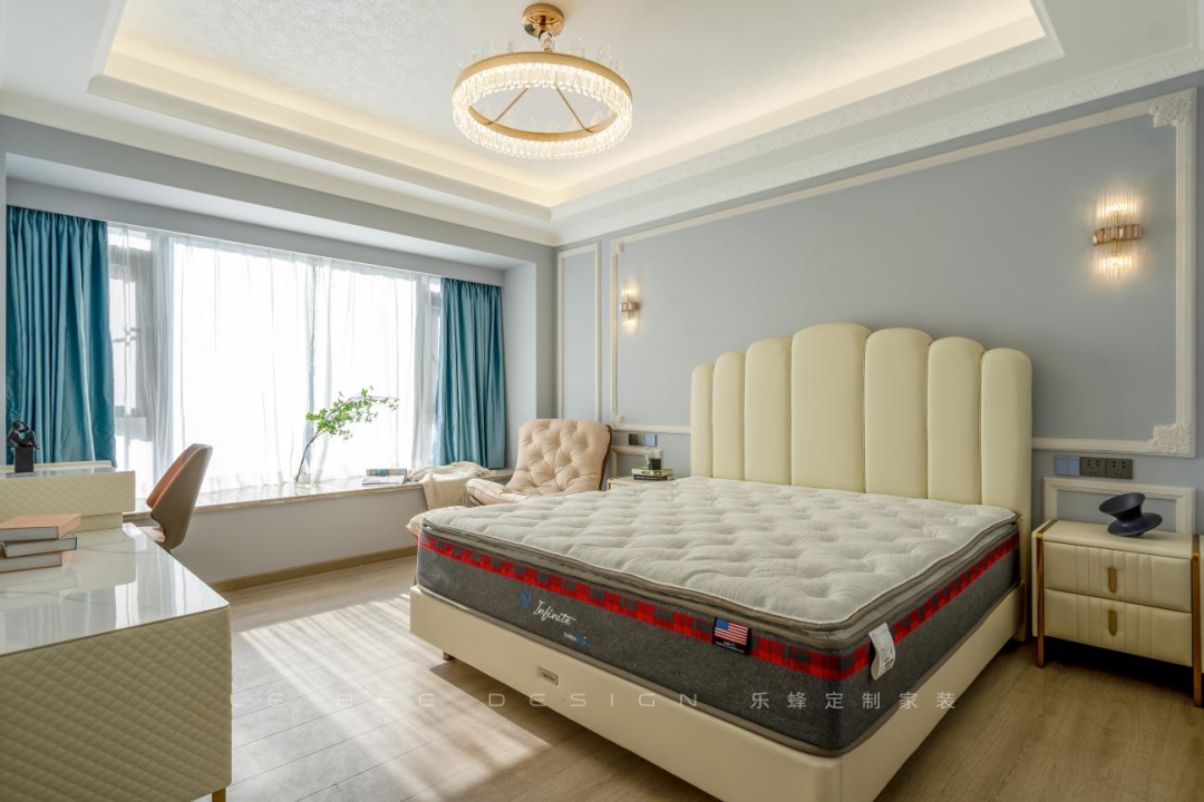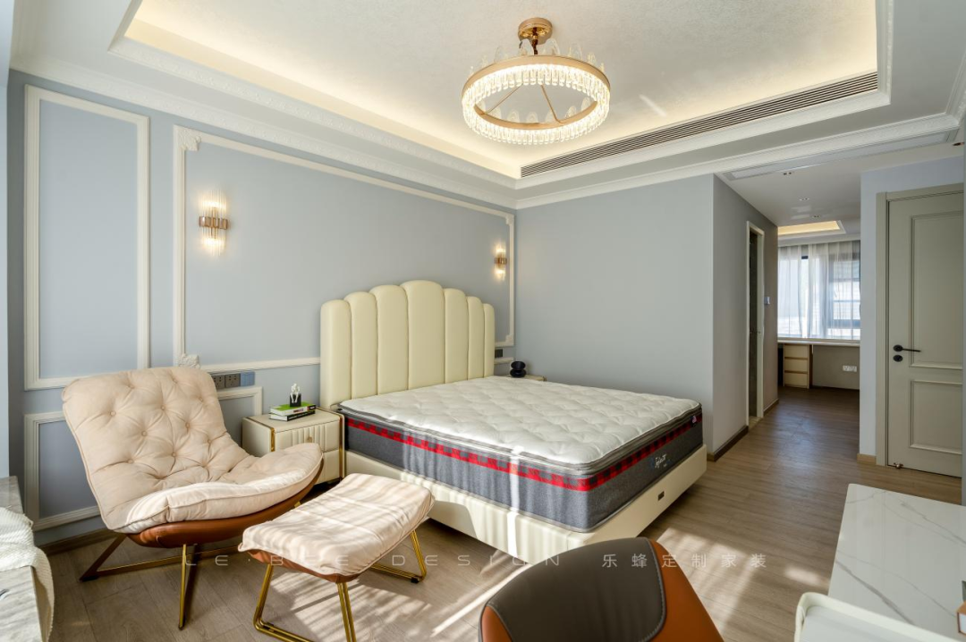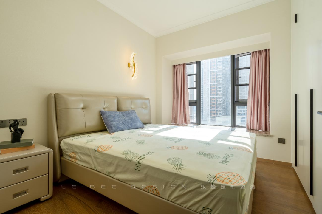 床尾設(shè)計(jì)的整面收納柜滿足了房間中的收納需求,寬敞大床配上床頭柜,功能齊全。