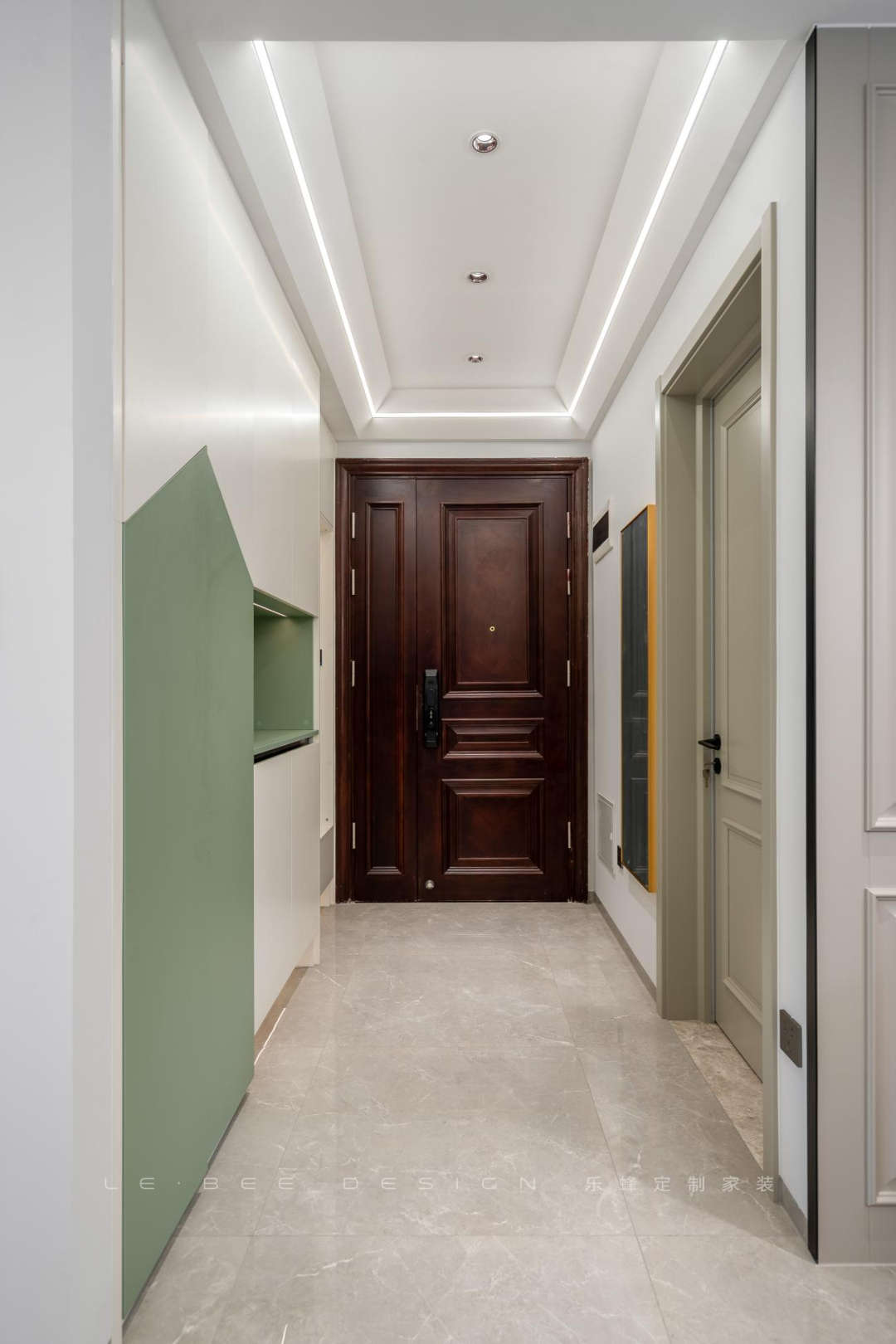 依據(jù)戶型優(yōu)勢(shì)靠墻設(shè)計(jì)了一組玄關(guān)柜,墻內(nèi)柜的形式不占據(jù)玄關(guān)的空間,過(guò)道寬敞,來(lái)去自如。玄關(guān)柜選擇白色和薄荷綠拼色,活潑但不夸張。玄關(guān)格局經(jīng)過(guò)細(xì)致和合理的規(guī)劃,把每個(gè)功能都?xì)w納在了其中。