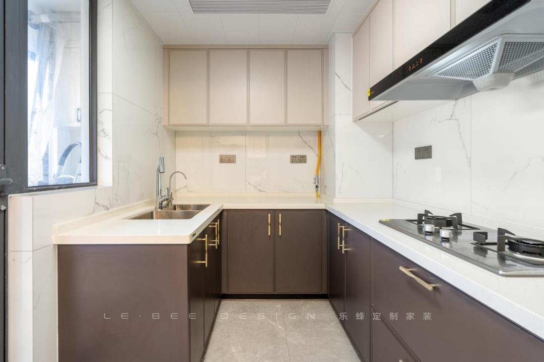 U字型布局,高雅的白棕配色,輕盈又穩(wěn)重。臺(tái)面設(shè)計(jì)根據(jù)洗、切、炒的人體工程學(xué)進(jìn)行規(guī)劃,省心的廚房設(shè)計(jì)能給下廚帶來(lái)歡樂(lè)。