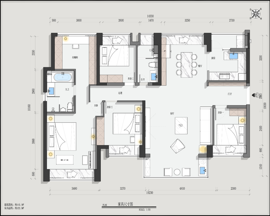 ③將次臥歸為主臥套件使用,設(shè)計(jì)為主臥衣帽間,解決了主臥收納空間不足的問(wèn)題。