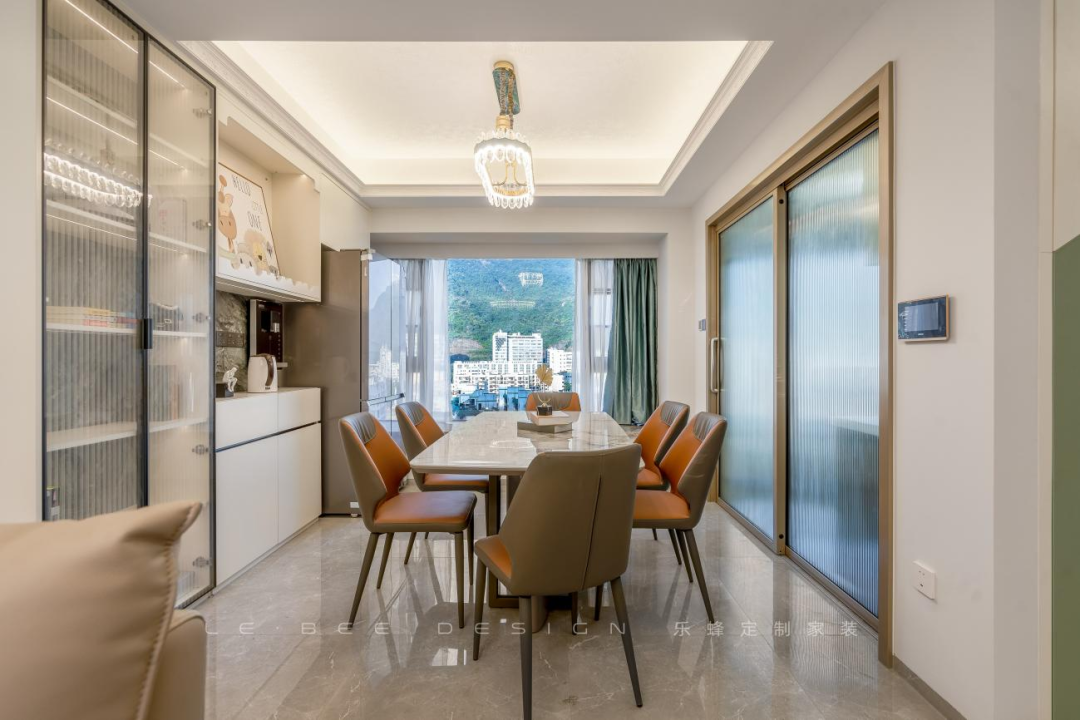 窗外風(fēng)景獨(dú)好,天然的景觀餐廳讓人不忍去打破,窗臺(tái)和飄窗沒(méi)有進(jìn)行多余的設(shè)計(jì),好的風(fēng)景不需要過(guò)多裝飾。餐廳頂面和地面設(shè)計(jì)同客廳如出一轍,走邊吊頂配水晶吊燈,異域風(fēng)情的氛圍滿滿,客餐廳大磚通鋪,地面延伸感十足,多維度拓展空間。