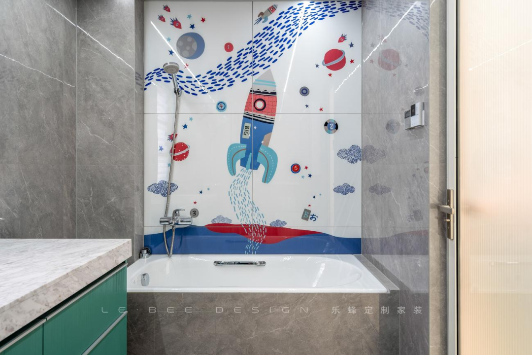 主衛(wèi)另一側(cè)設(shè)計(jì)了浴缸,墻面利用定制的卡通花磚鋪貼,為這一角落打造小小的海底世界。