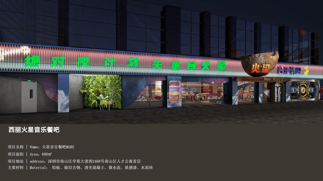 | 樓盤名稱:火星音樂餐吧 | 案例戶型:商業(yè)空間 | 案例面積:600平米 |