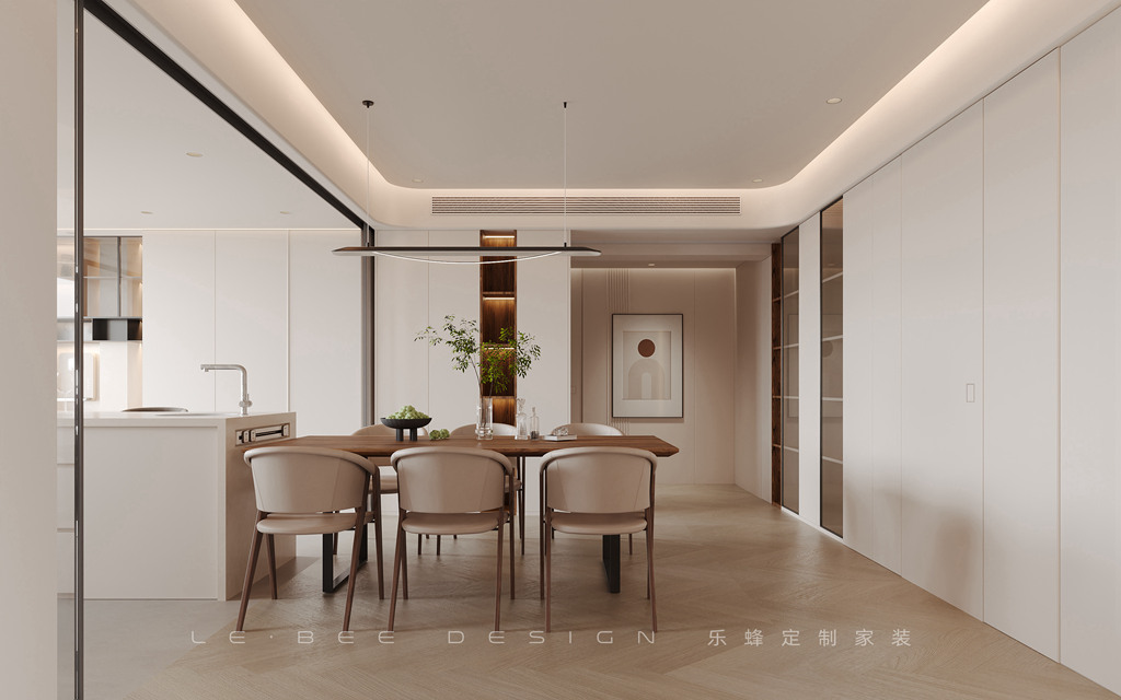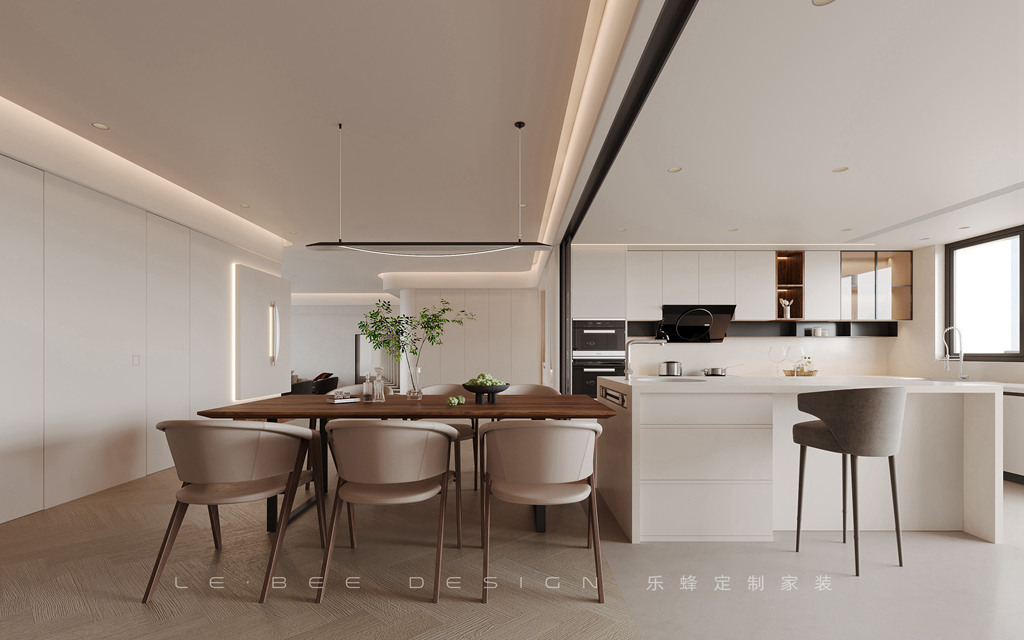 在餐廳可隱約遠(yuǎn)觀客廳區(qū),延伸的電視墻和原木懸空柜為餐廳空間形成裝飾都畫面美化空間。與家人一起在開放式的廚房烹飪好可口的飯菜,在原木餐桌椅上熱鬧享受美食和家人帶來的快樂。