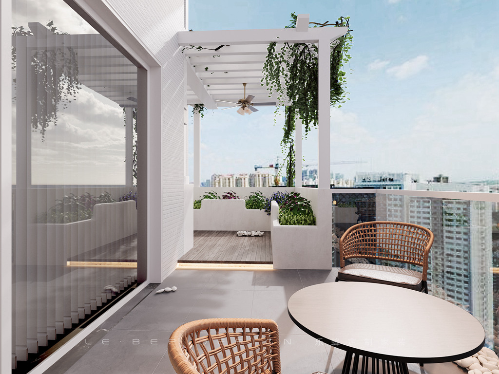 女業(yè)主可以坐在竹編椅子上,喝杯飲品,看著書,為小花小草們澆澆水。站在陽臺(tái)上眺望遠(yuǎn)方的城市,心曠神怡。