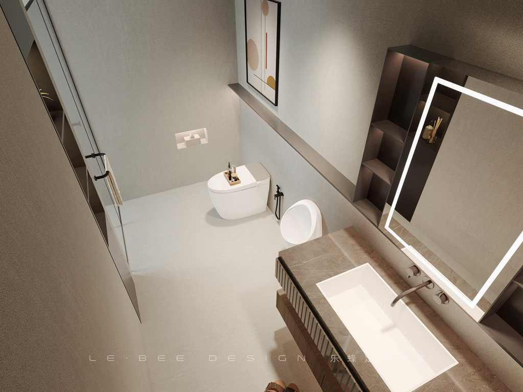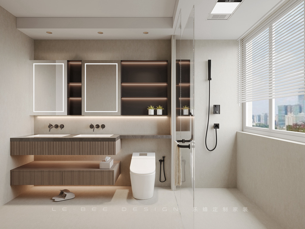 懸空柜的設(shè)計(jì)方便衛(wèi)生打掃,干濕分離的淋浴區(qū)則更加簡(jiǎn)約。
