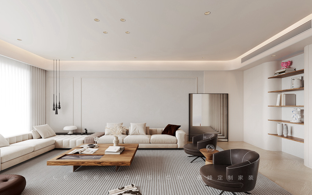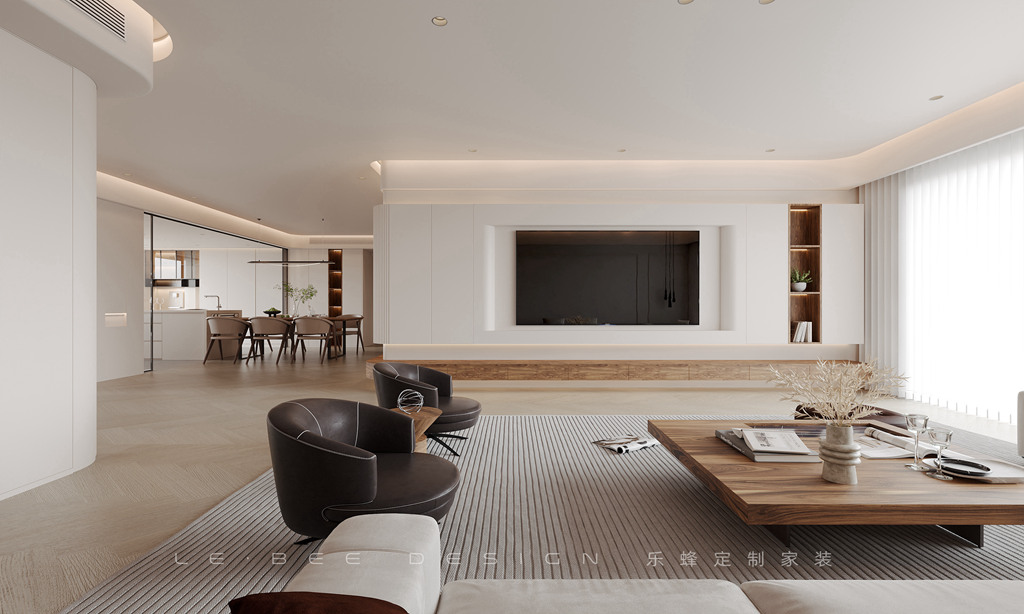 客廳部分,吊頂和暖光燈的懸浮設(shè)計(jì),讓整個(gè)空間充滿了氛圍感。