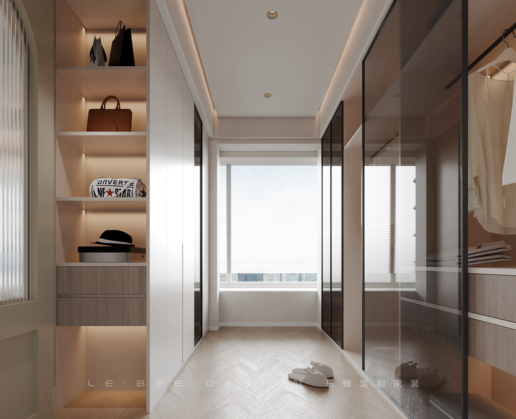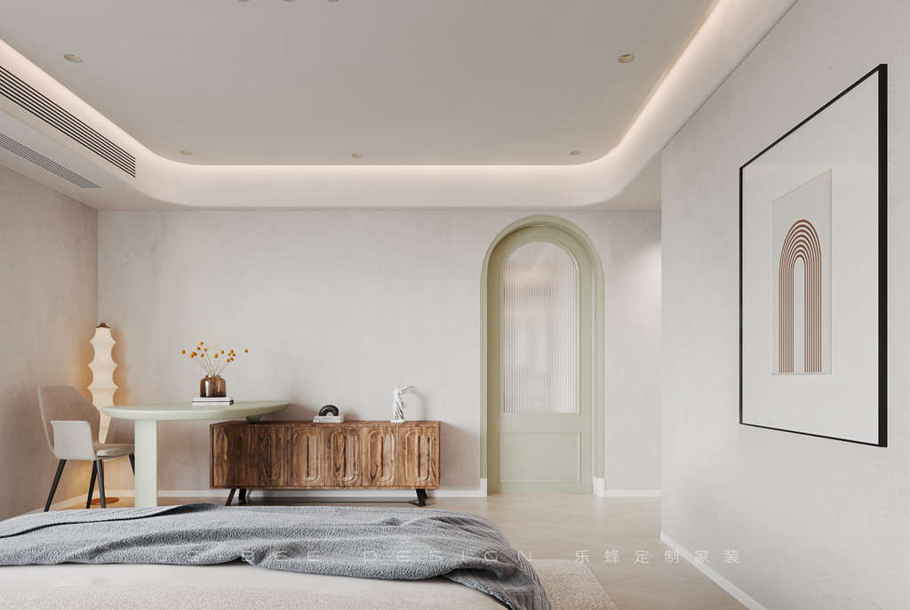 背景墻采用簡(jiǎn)約的粗糙感設(shè)計(jì),這邊掛上一幅簡(jiǎn)單的裝飾畫。休息區(qū)設(shè)計(jì)得非常舒適和安逸,淺灰、暖棕的配色給人一種獨(dú)特的舒適感。坐在床尾凳上,可以在這里簡(jiǎn)單地看書。而弧形、方形和橢圓形的空間,搭配淡綠色和原木復(fù)古風(fēng)格的元素,非常適合辦公或是看電影。衣帽間被獨(dú)立出來,與休息區(qū)分開。半透明門和簡(jiǎn)單的柜門保證了隱私的同時(shí),輕松地找到衣物。角落里設(shè)計(jì)了女業(yè)主手提包和帽子的專屬存放區(qū)。主衛(wèi)生間與傳統(tǒng)的設(shè)計(jì)不同,設(shè)計(jì)師設(shè)計(jì)了雙洗手盆讓空間更為大氣。