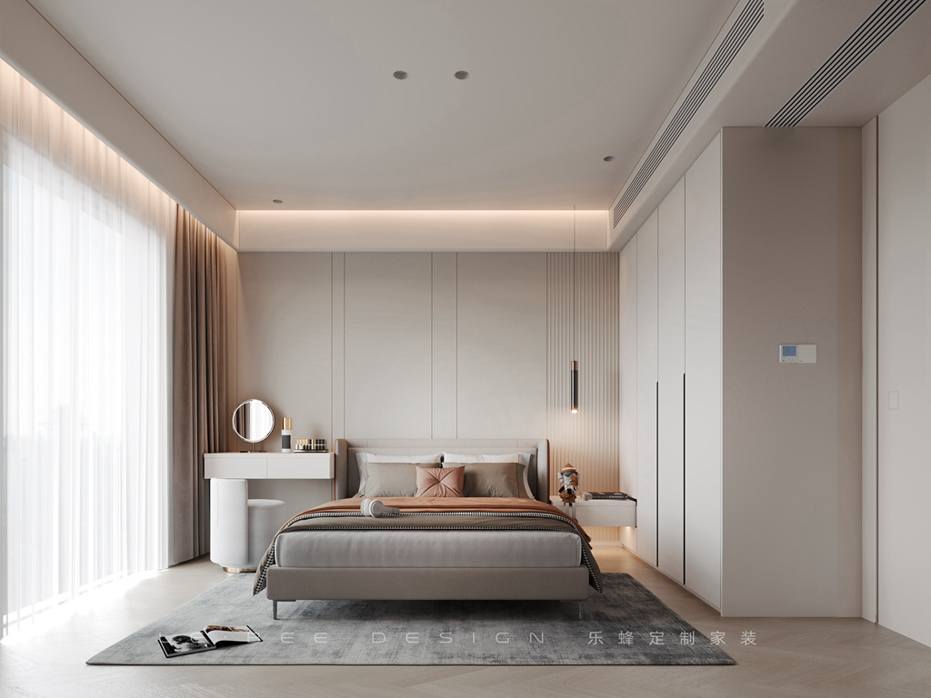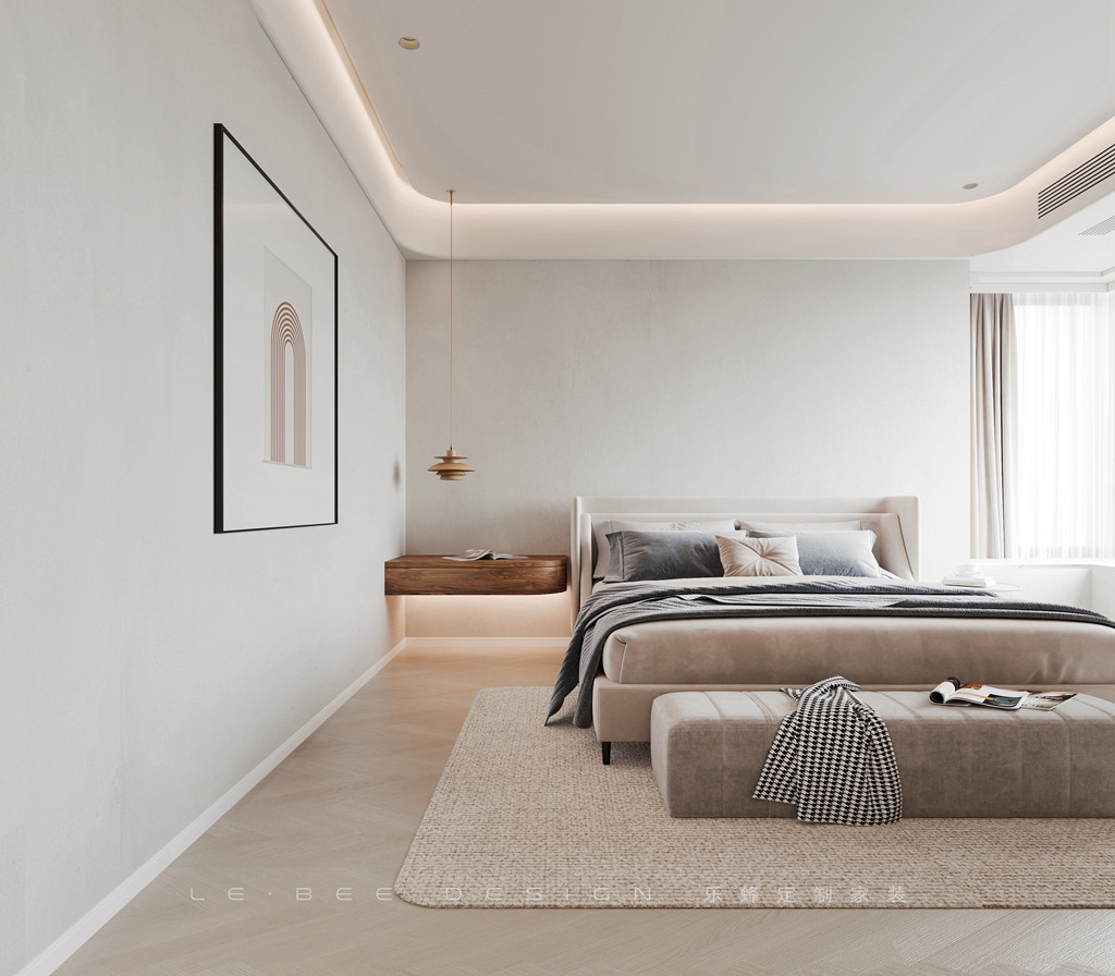 主臥室的燈光設(shè)計(jì)和客廳一樣,使用了懸浮頂和線燈、射燈,營(yíng)造出溫馨的氛圍。床頭的長(zhǎng)線吊燈和懸空的原木床頭柜搭配魚骨紋地板,彌漫著復(fù)古的氣息。