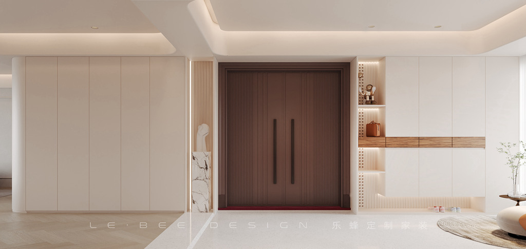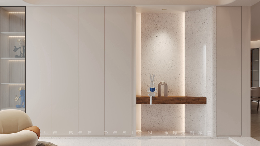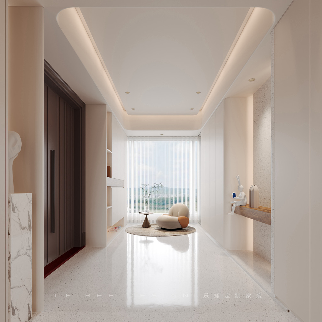 打開入戶門,就會(huì)看到大理石、燈帶和原木帶來的高級(jí)與大氣感,甚至有一只小白兔靜靜地坐在原木上看書,意境十足。設(shè)計(jì)師通過入戶大氣的玄關(guān)將戶外的山景帶入室內(nèi),創(chuàng)造出一幅天然而美妙的畫卷。