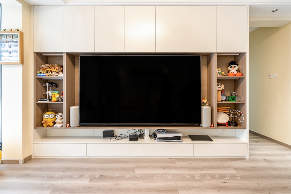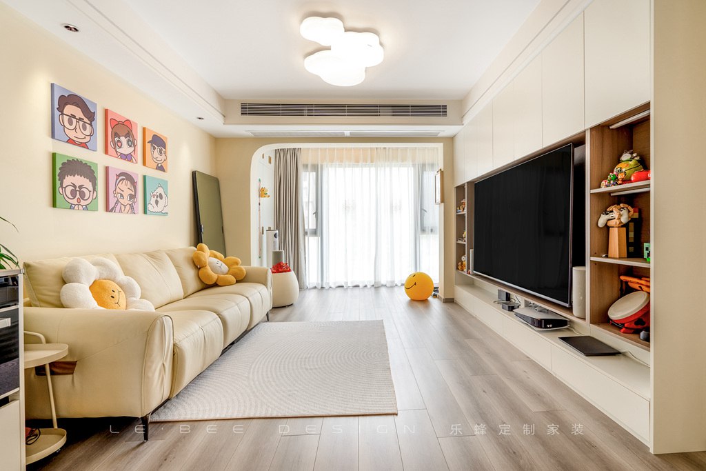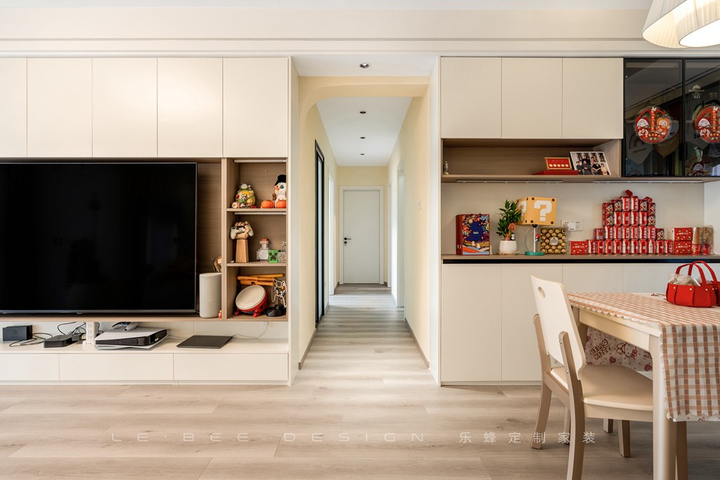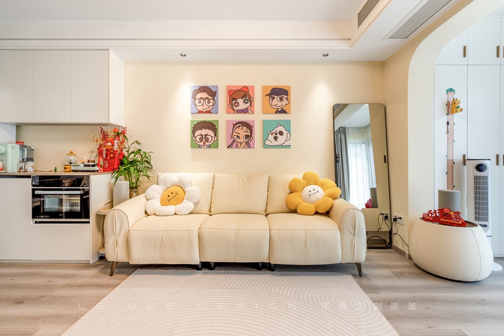 客廳中,奶油黃與木地板的搭配營造出溫馨舒適的氛圍,云朵狀的主燈照亮整個空間。一字形的沙發(fā)搭配小地毯和兩個可愛的雛菊抱枕,而沙發(fā)背景則以卡通頭像裝飾,別具創(chuàng)意且充滿可愛和清新的感覺。全身鏡則巧妙地放置在沙發(fā)旁邊,供業(yè)主隨時整理儀容儀表。電視墻的設(shè)計十分出色,采用全墻電視柜的形式,為收納提供了充足的空間。兩邊和地柜上則設(shè)計了專門的空間用來裝飾和放置音響、路由器等設(shè)備,而柜子內(nèi)還預留了線孔,線路隱藏而精致。