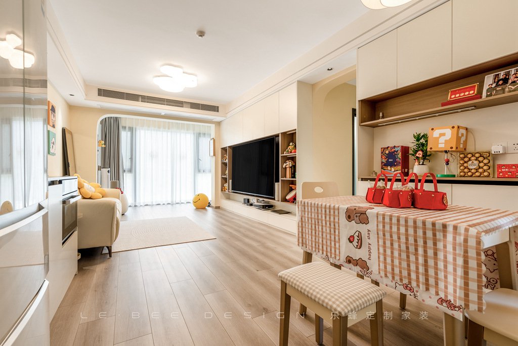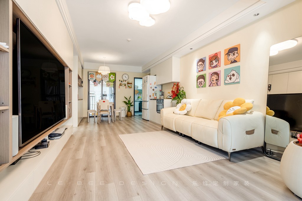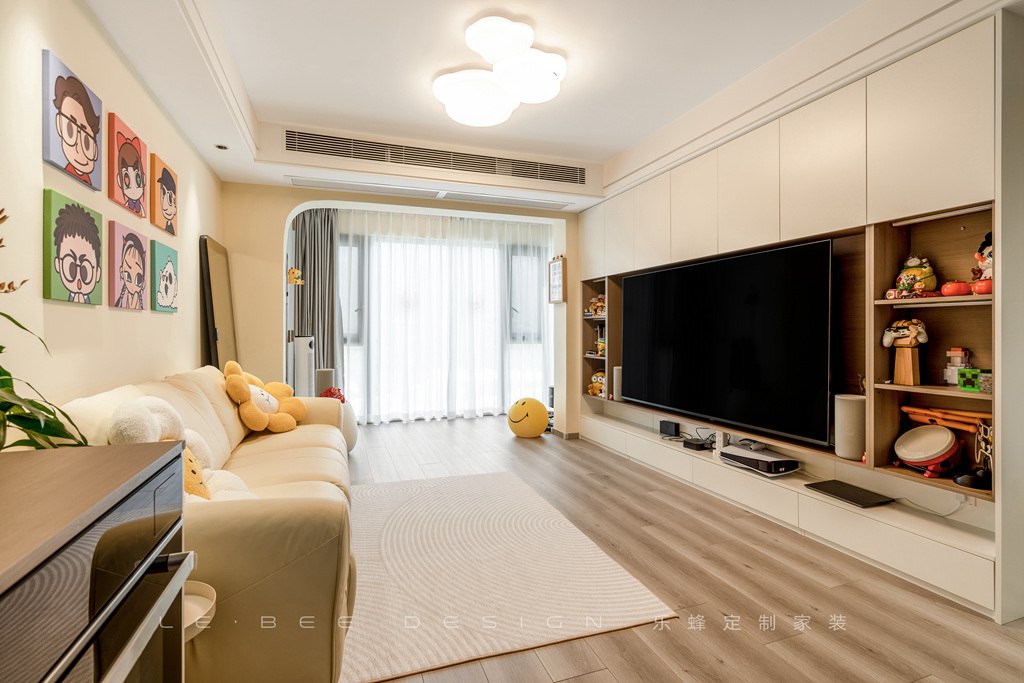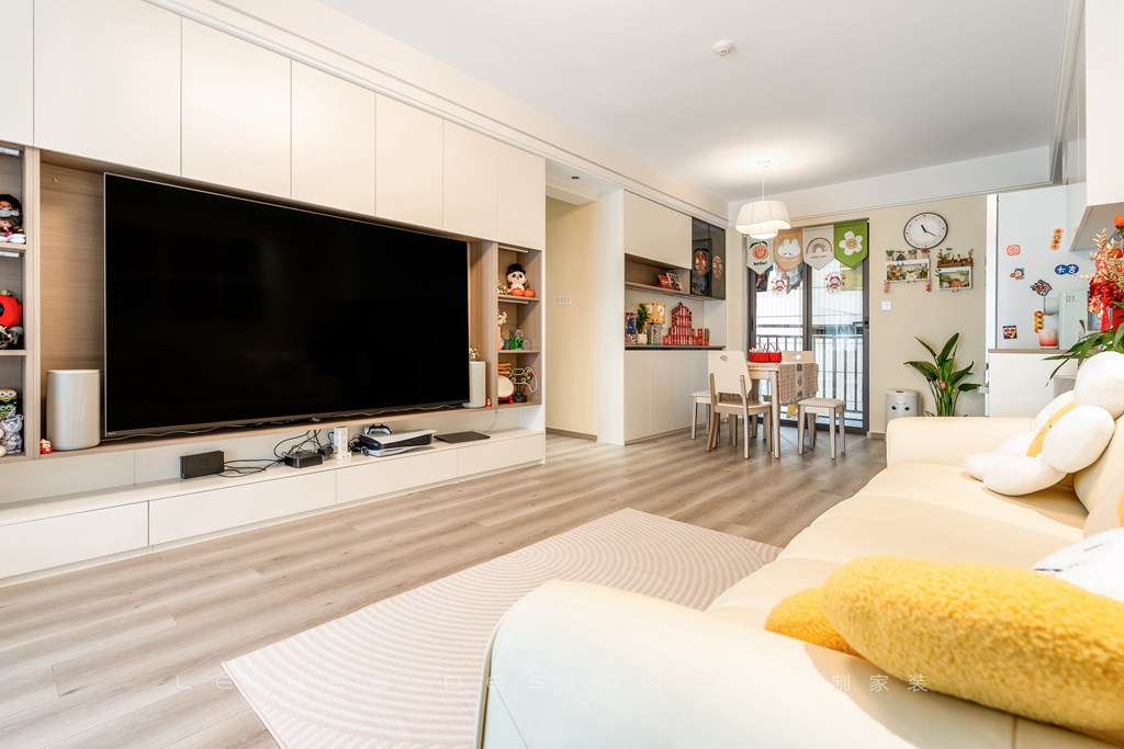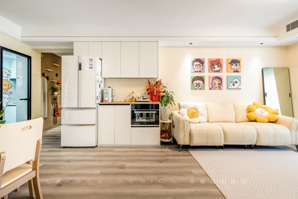 客廳中,奶油黃與木地板的搭配營造出溫馨舒適的氛圍,云朵狀的主燈照亮整個空間。一字形的沙發(fā)搭配小地毯和兩個可愛的雛菊抱枕,而沙發(fā)背景則以卡通頭像裝飾,別具創(chuàng)意且充滿可愛和清新的感覺。全身鏡則巧妙地放置在沙發(fā)旁邊,供業(yè)主隨時整理儀容儀表。電視墻的設(shè)計十分出色,采用全墻電視柜的形式,為收納提供了充足的空間。兩邊和地柜上則設(shè)計了專門的空間用來裝飾和放置音響、路由器等設(shè)備,而柜子內(nèi)還預留了線孔,線路隱藏而精致。