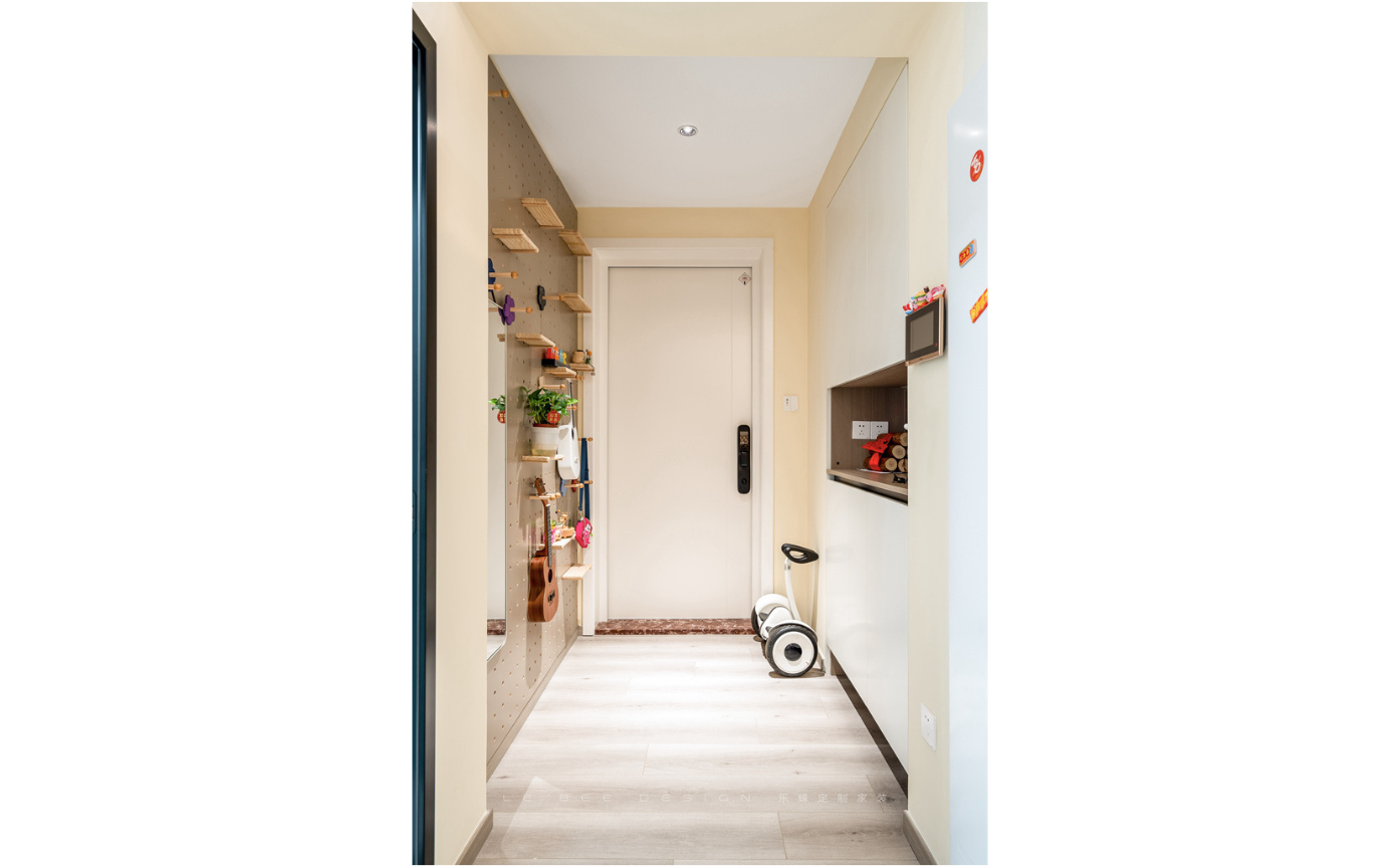 這里經(jīng)由玄關(guān)設(shè)計師細心打造的洞洞板墻,巧妙地融合了收納功能和美觀,嵌入墻面的換鞋凳子演繹著神秘而不占空間的魅力。另一邊則是精心設(shè)計的玄關(guān)鞋帽柜,獨具特色,各自展現(xiàn)著不同的魅力。