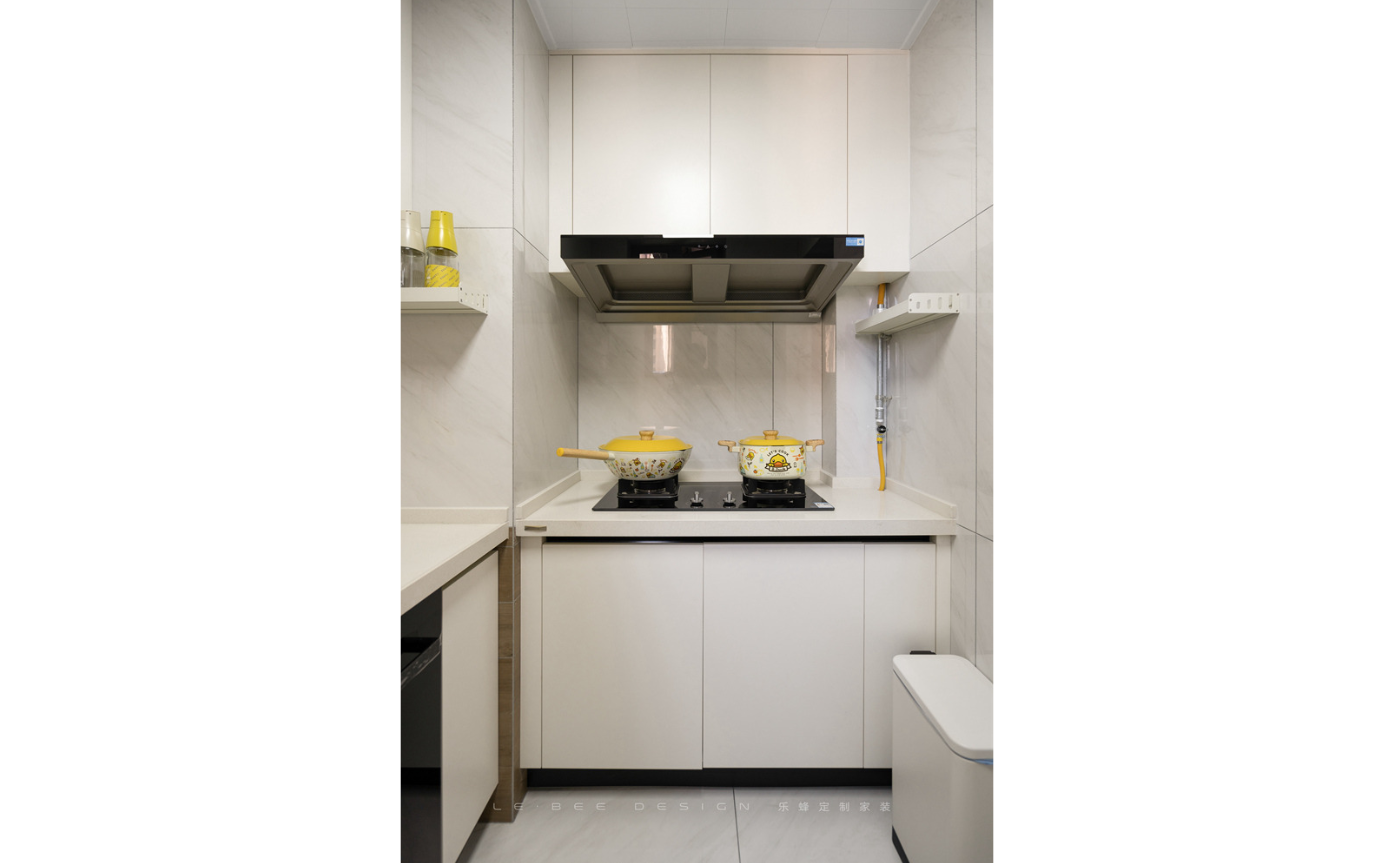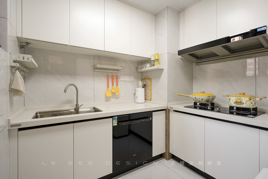 廚房采用了L形設(shè)計,高低柜巧妙地嵌入了電器,大單槽的設(shè)計更顯簡約。墻上還設(shè)計了置物架,讓瓶瓶罐罐井然有序地擺放。