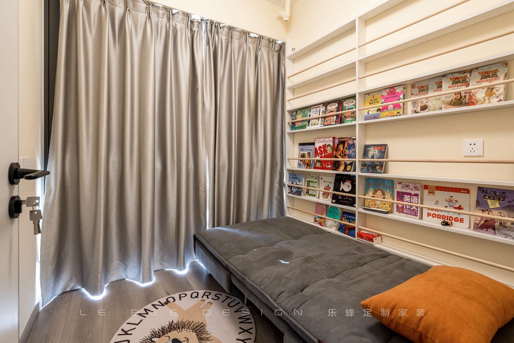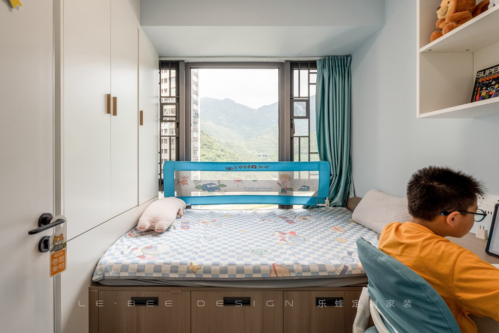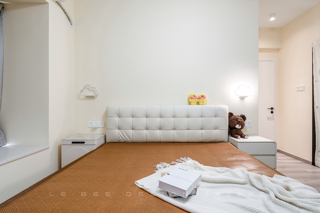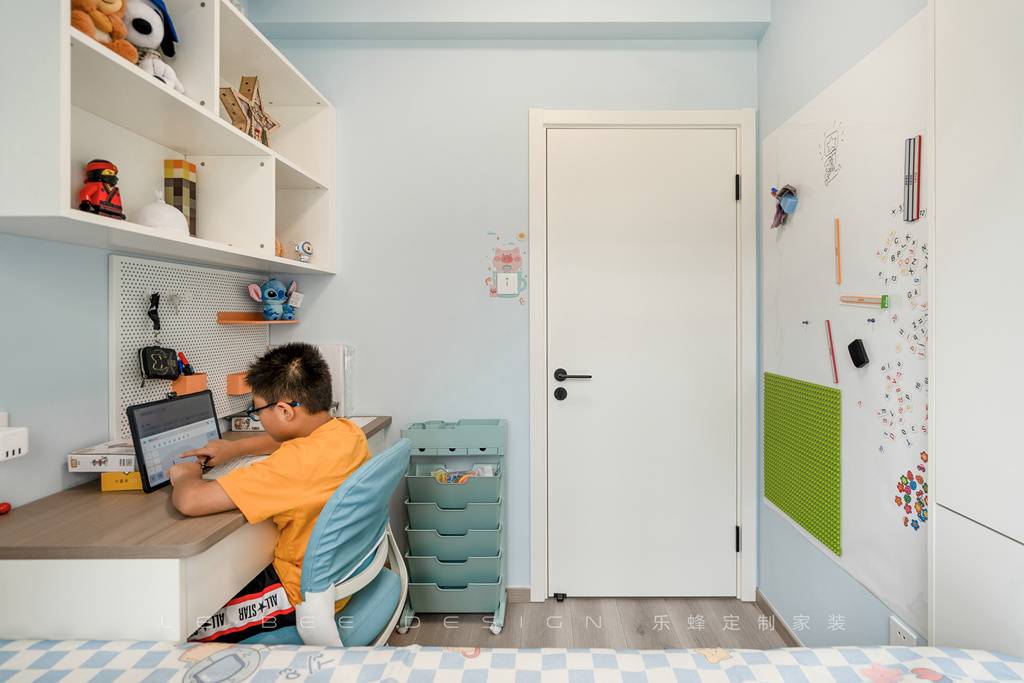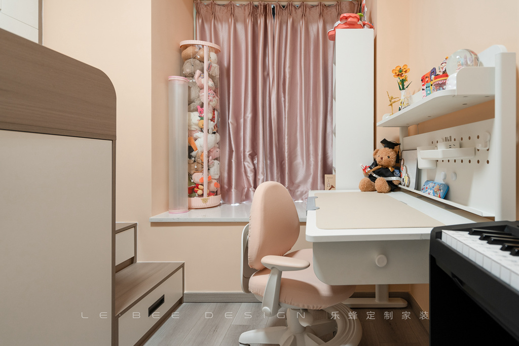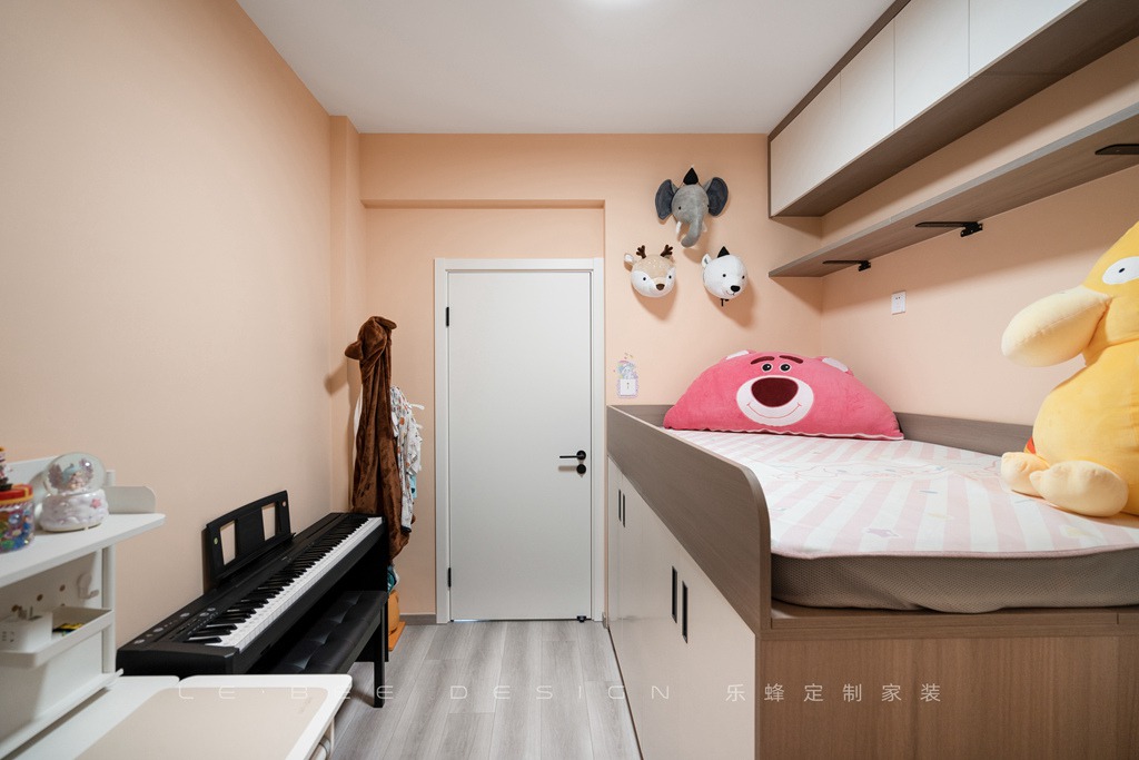 男孩房以淡淡的藍色裝飾,搭配榻榻米設(shè)計,床下空間可用來收納小男孩的衣物,床尾處還設(shè)計了收納柜。另一側(cè)則簡潔地設(shè)置了一個學習桌,搭配舒適的360°旋轉(zhuǎn)學習椅子,供小孩子舒適地進行學習。墻面還設(shè)計了一個黑板區(qū)域,讓小男孩可以自由發(fā)揮創(chuàng)意。女孩房以淡淡的粉色裝點,同樣采用榻榻米設(shè)計。由于女孩喜歡彈鋼琴,因此榻榻米設(shè)計得更高一些,方便收納衣物也空出鋼琴空間。床的上方還設(shè)計了一個隔板和一個收納柜,可以放置女孩喜歡的小物品。床頭還掛上了幾個可愛的動物裝飾。學習區(qū)和飄窗也是粉色搭配,可愛又清晰。