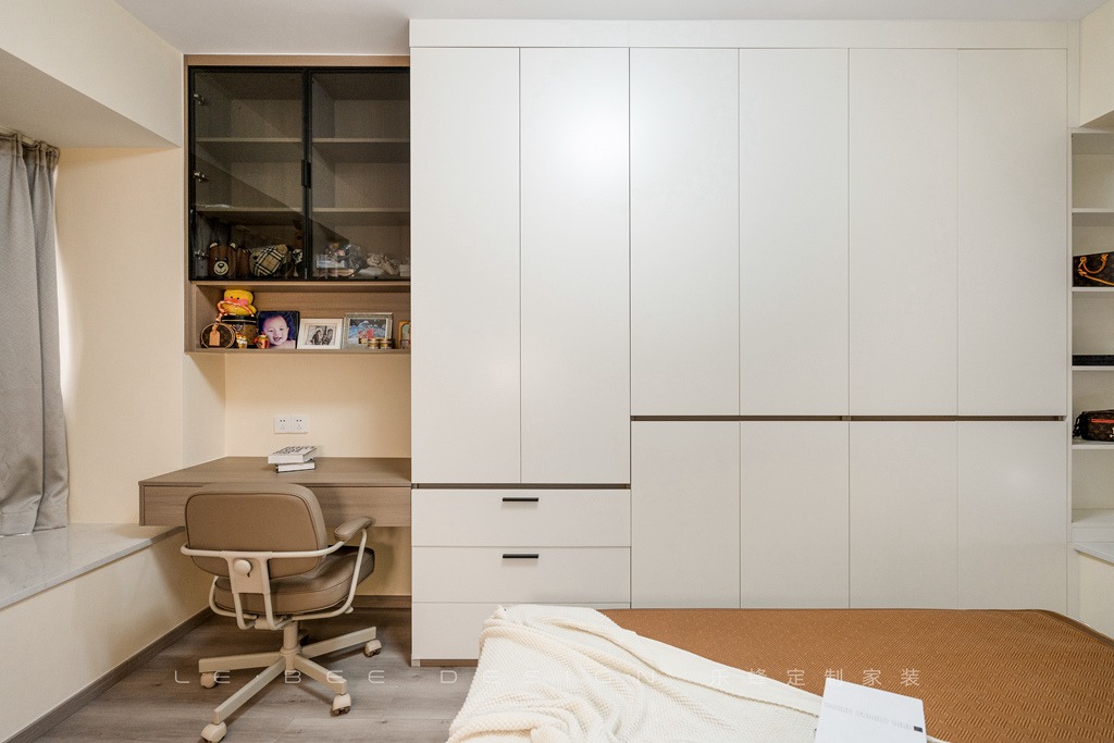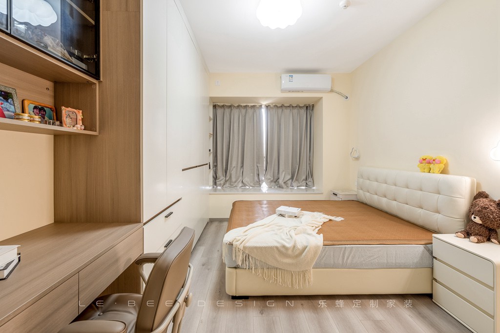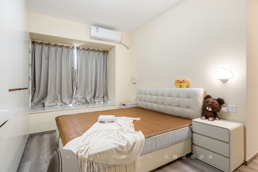 主臥的墻面沒有過多的裝飾,而是以兩個云朵墻燈點亮,床則選用了白色皮質(zhì),床頭柜中還設(shè)計了智能充電柜,方便手機充電。飄窗則搭配了灰色的遮光窗簾,床尾處則是一個衣柜,還設(shè)計了抽屜,方便放置襪子和貼身衣物。另外甚至還有一個懸空的梳妝臺,搭配360°旋轉(zhuǎn)椅子,無論是進行梳妝打扮還是簡單辦公,都能得心應(yīng)手。主衛(wèi)室以簡約時尚的灰白色調(diào)設(shè)計,使用防水浴簾進行了干濕分離,空間布局緊湊而不擁擠,同時也無需過高的裝修成本。