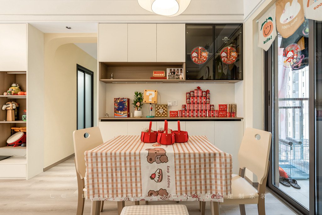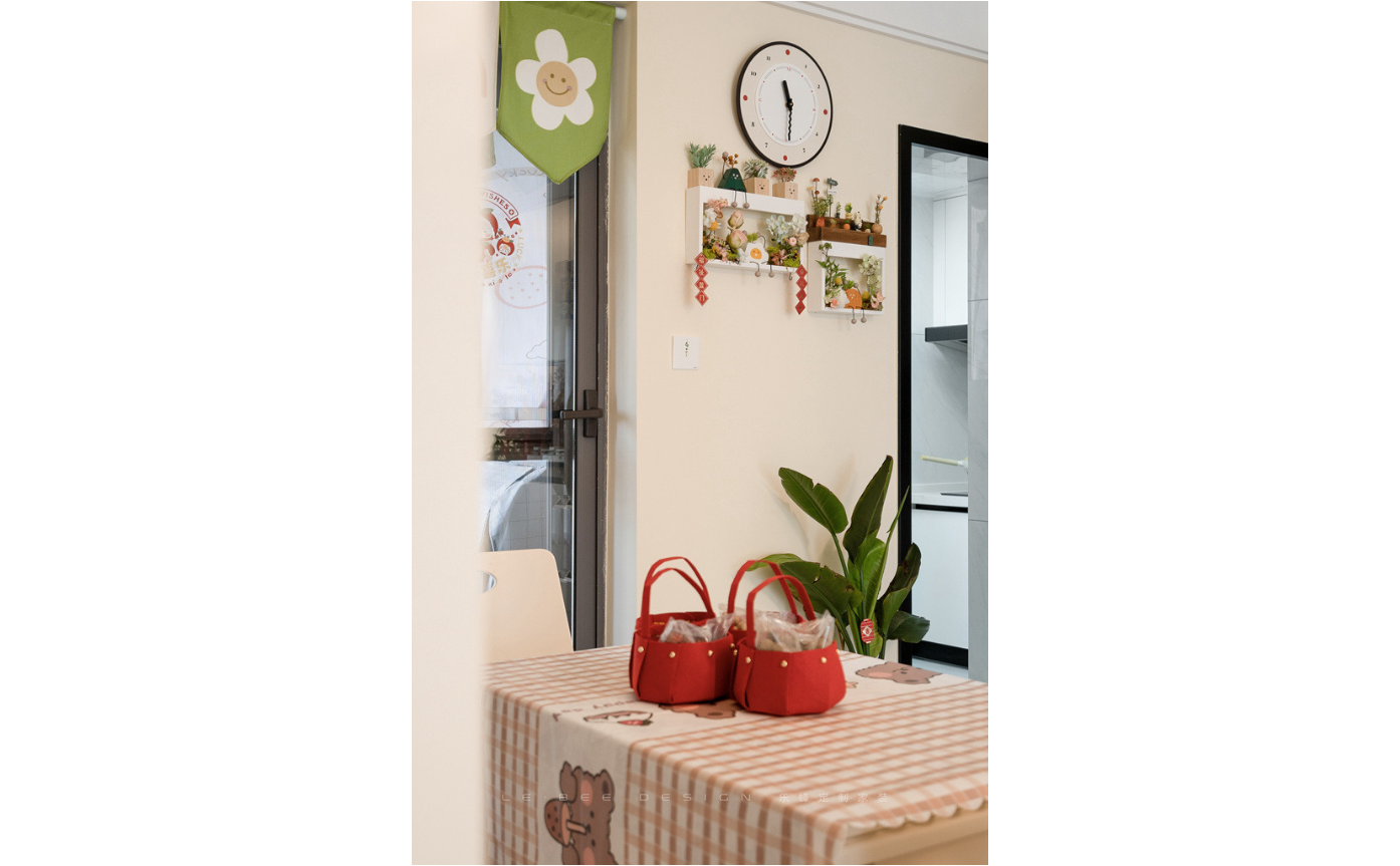 餐廳的四人桌旁鋪上帶有格子圖案的布料,餐椅也采用了相同的設(shè)計,突顯了整體的美觀。餐邊柜以白色柜門搭配灰色玻璃柜門的設(shè)計,消除了單調(diào)感,增添了一絲高級感。餐廳旁邊空置的空間被設(shè)計成不顯空蕩,而是搭配了一盆天堂鳥盆栽,放置在智能垃圾桶旁,墻上掛著一個時鐘,再搭配壁掛綠植,清晰又靈動。此外,還有一個小陽臺,只要推開玻璃門,即可享受清新的空氣。