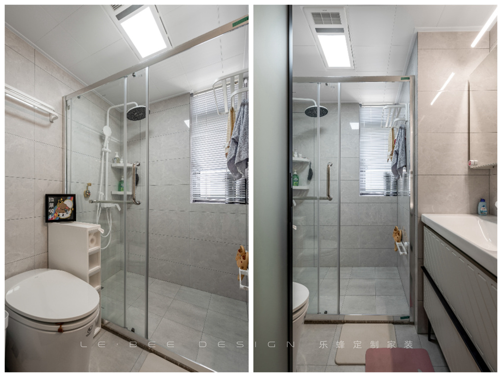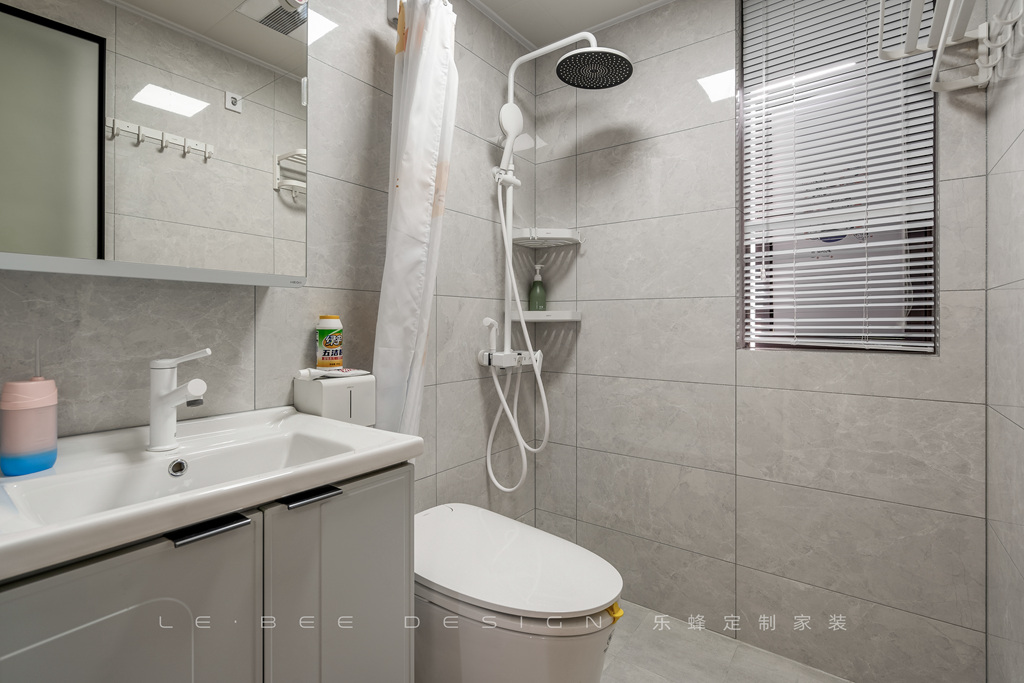 公共衛(wèi)生間采用了推拉門,實現(xiàn)了干濕分離,懸空的陶瓷洗漱臺設(shè)計精美,鏡面柜更方便收納洗漱用品。淋浴區(qū)則設(shè)計了拖鞋架,而百葉窗簾的設(shè)計則為整體增添了時尚感和顏值。