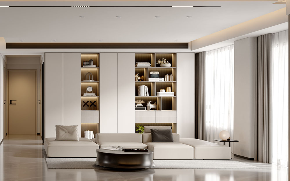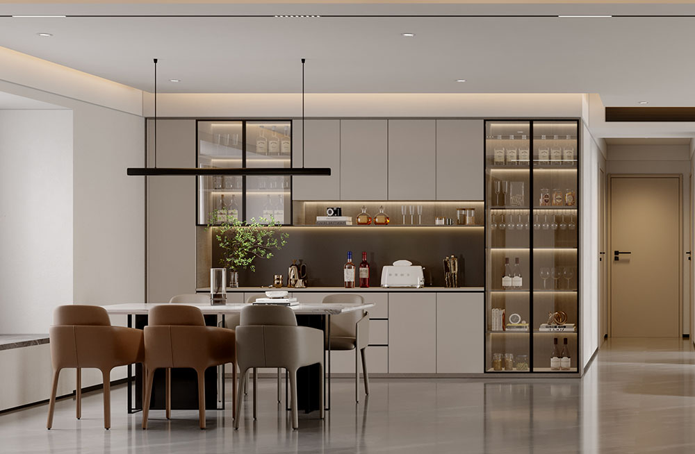 這個(gè)案例為五口之家設(shè)計(jì)了一個(gè)宜居舒適的客廳空間。通過懸掛的電視背景墻和隱藏的燈帶,創(chuàng)造立體感和視覺效果,提升了墻面的美觀和實(shí)用性。開放式餐廳以簡(jiǎn)約實(shí)用的餐桌為中心,提供了自由舒適的用餐環(huán)境,并保持空間的寬敞感。米白和灰色調(diào)的選擇營(yíng)造了溫馨典雅的色彩氛圍,為家庭帶來輕松愜意的生活感。