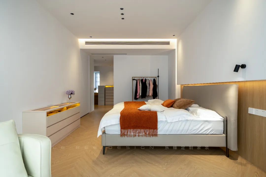 女兒房沒(méi)有過(guò)多復(fù)雜設(shè)計(jì),整體采用了米色乳膠漆,搭配成品床墊,注重了舒適和簡(jiǎn)約風(fēng)格。房間中放置了可愛(ài)的裝飾元素,為空間增添了溫馨氛圍。最有趣的設(shè)計(jì)是靠窗的位置,特意設(shè)計(jì)了一個(gè)小衣帽間,兼顧了儲(chǔ)物和衣物擺放的需求,同時(shí)也充分利用了空間。此外,衣帽間頂部延伸設(shè)計(jì)成懸浮書(shū)桌,既實(shí)現(xiàn)了辦公學(xué)習(xí)的功能,又增添了房間的靈活性和實(shí)用性。