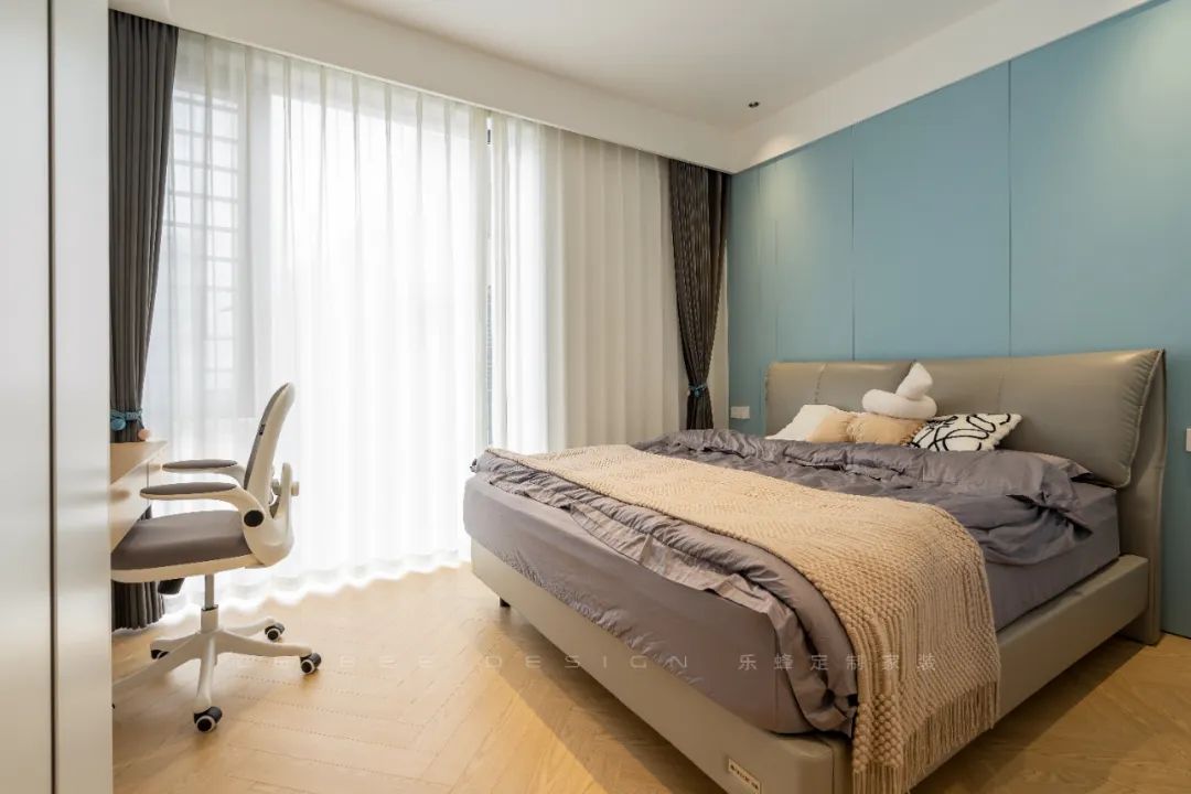 進(jìn)門(mén)右側(cè)是一門(mén)到頂?shù)囊鹿?,以?jiǎn)潔大方的米白色柜門(mén)設(shè)計(jì),充分利用空間,提供了豐富的存儲(chǔ)選項(xiàng),同時(shí)為整個(gè)房間增添了清爽的視覺(jué)效果。男孩房以清新舒適的藍(lán)色背景墻和簡(jiǎn)約的單眼皮吊頂為特色,搭配現(xiàn)代風(fēng)格的成品床及淺色系床上用品,展現(xiàn)出精心設(shè)計(jì)的空間感。此外,特別設(shè)計(jì)了實(shí)木懸浮書(shū)桌,為空間增添了自然的元素,讓整個(gè)空間更加溫馨舒適。