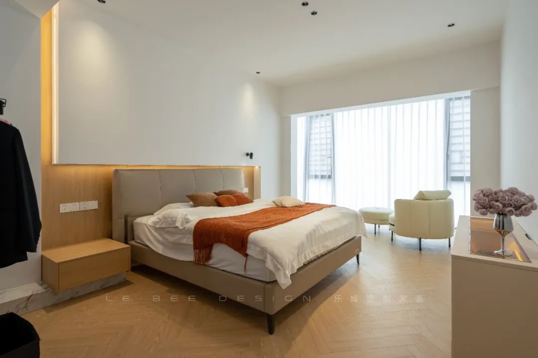 臥室采用無(wú)主燈設(shè)計(jì),射燈主要用于重點(diǎn)照明,吊燈則用于裝飾空間,而燈帶則為氛圍燈光增添溫馨氣氛。床頭的護(hù)墻搭配線性燈提升了整體高級(jí)感。傳統(tǒng)的床頭柜被取消,木作大多以原木色為主,背景墻采用凹凸設(shè)計(jì),原木巖板上墻并嵌入燈帶,增強(qiáng)了空間的層次感。床品以淺色為主,簡(jiǎn)潔舒適。休息區(qū)的設(shè)計(jì)以黑白棕色為主調(diào),突顯出房間的高級(jí)質(zhì)感和品味。床尾玩鬧的小貓裝飾細(xì)節(jié)則為整個(gè)空間注入了一絲趣味與活力,使人們?cè)谛菹r(shí)感受到更加舒適和愉悅。主衛(wèi)以大面積的大理石灰為主基調(diào),展現(xiàn)出飽滿的質(zhì)感和高級(jí)感。冷色系與暖色燈光相得益彰,營(yíng)造出舒適宜人的氛圍。洗漱區(qū)采用木質(zhì)浴室柜搭配智能鏡柜,美觀大方,同時(shí)抽屜式和開(kāi)放式儲(chǔ)物設(shè)計(jì)豐富了洗漱區(qū)的收納空間。干濕分離設(shè)計(jì)采用長(zhǎng)虹玻璃隔斷,實(shí)現(xiàn)了空間的合理利用和功能分區(qū)。
