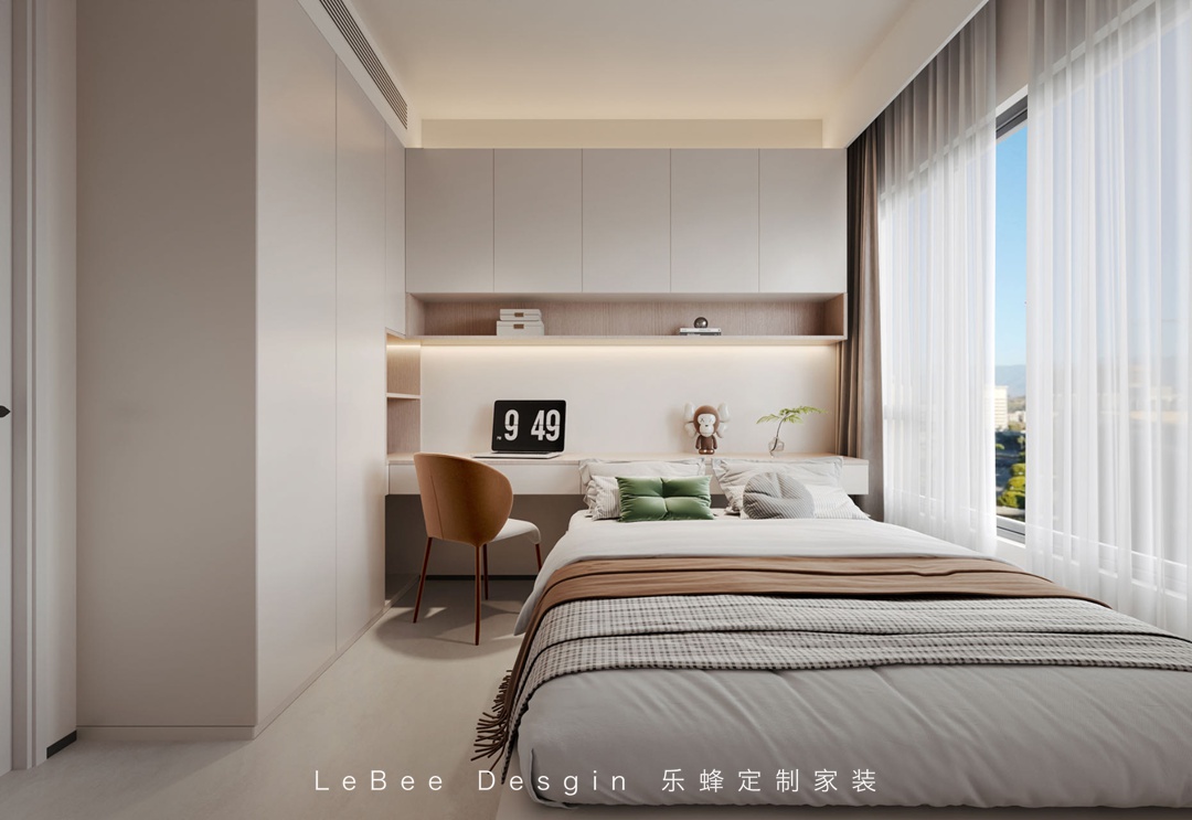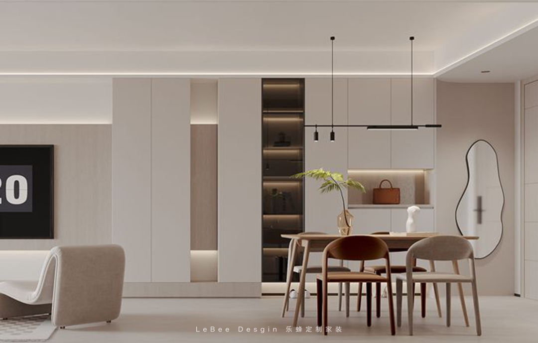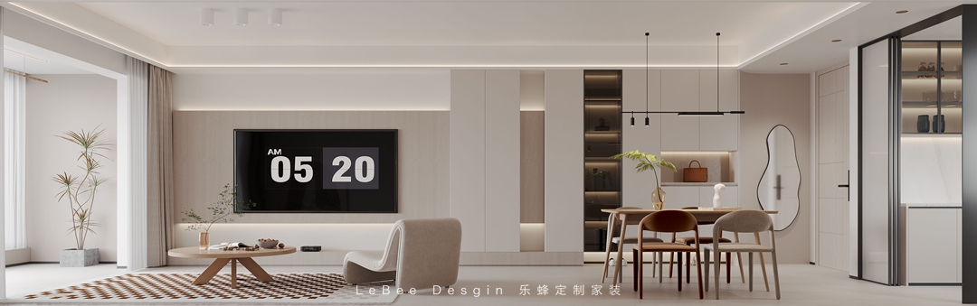 本案業(yè)主是一位很有想法的溫暖男青年,所以樂(lè)蜂裝飾的方碩老師在設(shè)計(jì)上使用最簡(jiǎn)潔的表達(dá),結(jié)合現(xiàn)代主義,選擇柔和的奶油色調(diào)色板和天然生態(tài)材料,營(yíng)造甜而不膩的舒適和溫暖~