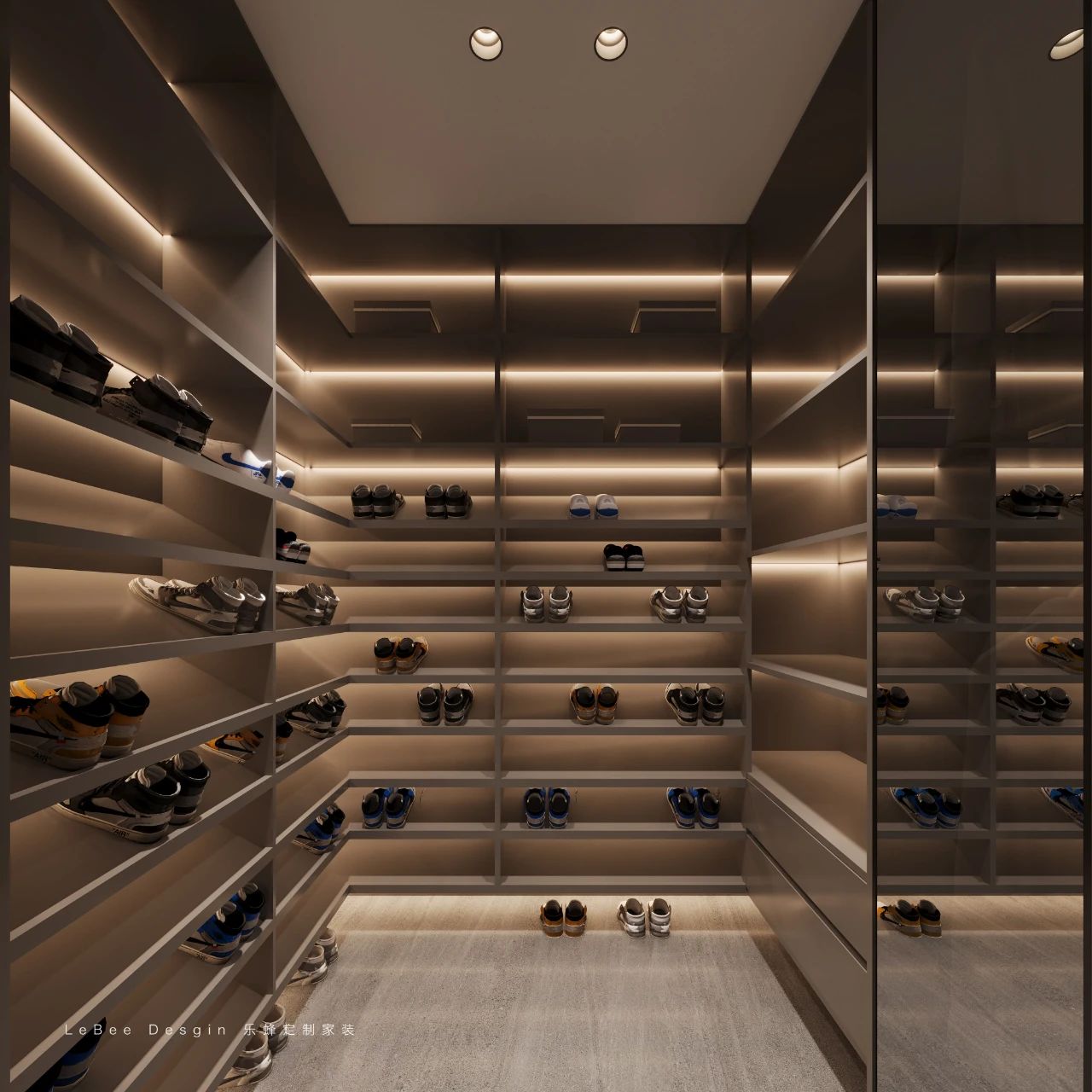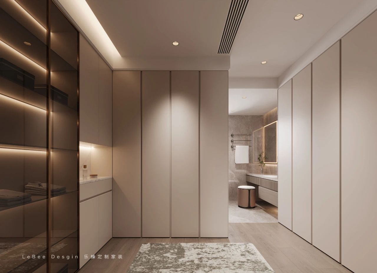 步入式衣帽間,內(nèi)部規(guī)劃整齊有序,分區(qū)明確且合理,滿足了各類衣物與物品的收納需求。其外觀與整體風(fēng)格保持一致,低調(diào)中透露著奢華。