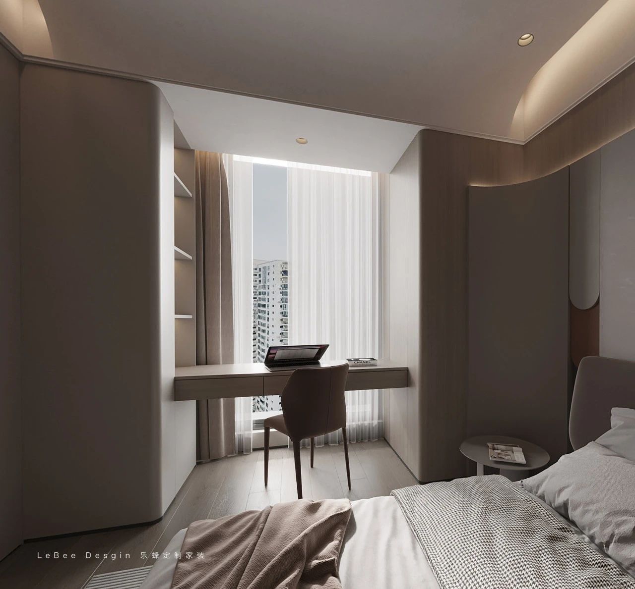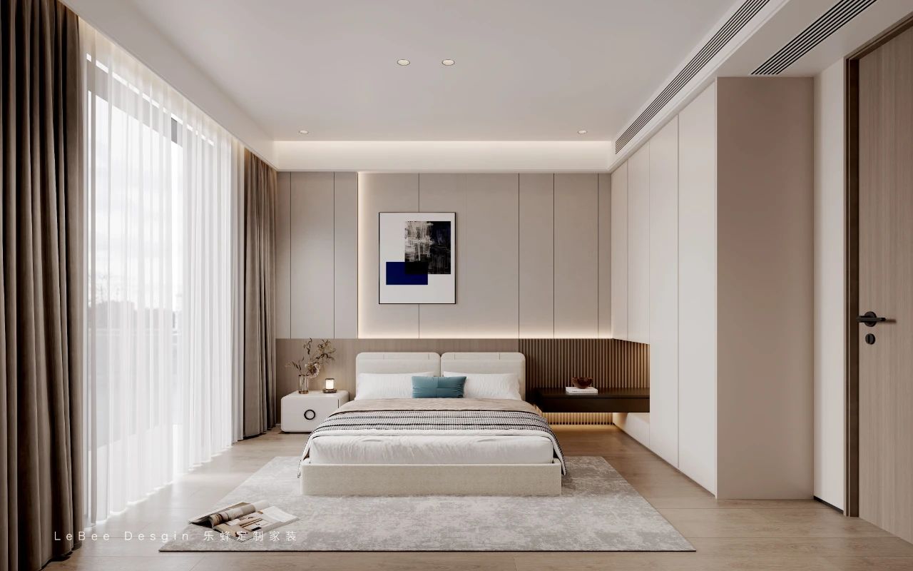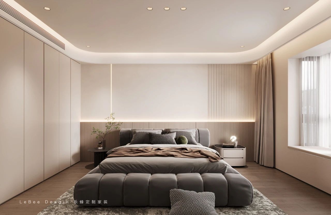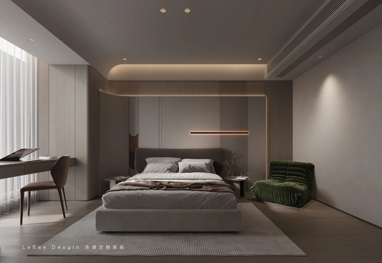 主臥采用懸浮吊頂,提升空間層次感。床頭背景是木飾面與木格柵的組合,木飾面質(zhì)感溫暖,木格柵增添立體感,內(nèi)嵌燈帶營造浪漫氛圍。色彩搭配和諧雅致,中性調(diào)結(jié)合少量金色元素凸顯輕奢質(zhì)感。