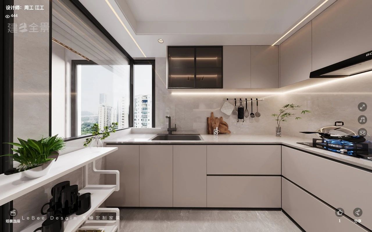 U 型廚房布局合理,保持了流暢的動(dòng)線。精心規(guī)劃了收納柜等置物空間,并且與家政區(qū)相連接,使整體動(dòng)線更為順暢自然。