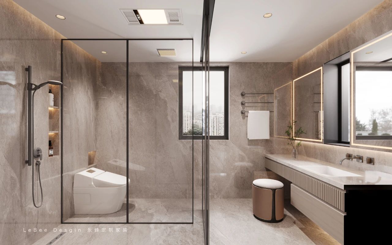 步入主衛(wèi),空間寬敞明亮,石材地磚美觀防滑。墻面瓷磚獨(dú)特,洗漱區(qū)藝術(shù)感十足,臺下盆配簡約水龍頭,鏡子有柔光燈。 沐浴區(qū)有獨(dú)立淋浴間,干濕分離,噴頭模式多樣,智能馬桶便利。天花板弧形設(shè)計(jì)與臥室呼應(yīng),燈光豐富,浴室柜精致,收納有序。 主衛(wèi)功能性與優(yōu)雅精致兼具,打造舒適愜意有品味的私人衛(wèi)浴空間。