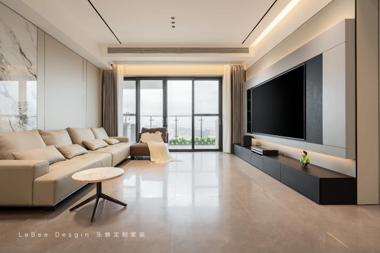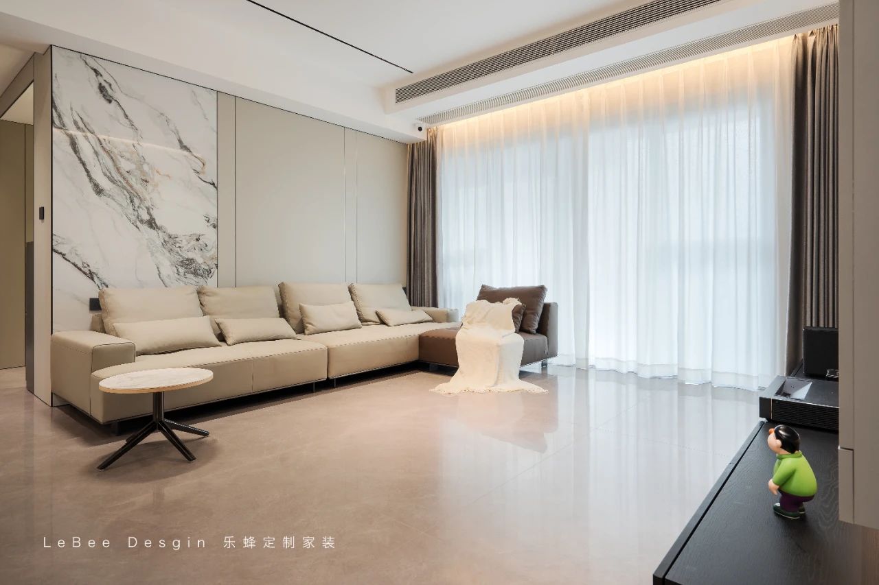在客廳中,電視背景墻特意定制了一整排的柜子,強(qiáng)大的收納能力成為了生活堅(jiān)實(shí)的底氣。并且,客廳和陽(yáng)臺(tái)實(shí)現(xiàn)打通,夢(mèng)幻簾與紗簾相互搭配,能夠隨心調(diào)節(jié)室內(nèi)的光影,還使得空間在視覺上增大了一倍。