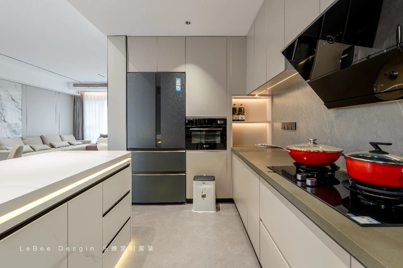 開放式的餐廚設(shè)計(jì),讓烹飪不再是一個(gè)人的孤獨(dú)勞作,而是與家人互動(dòng)交流的溫馨時(shí)刻。廚房中,白色的櫥柜搭配黑色的拉手,簡(jiǎn)潔又實(shí)用。