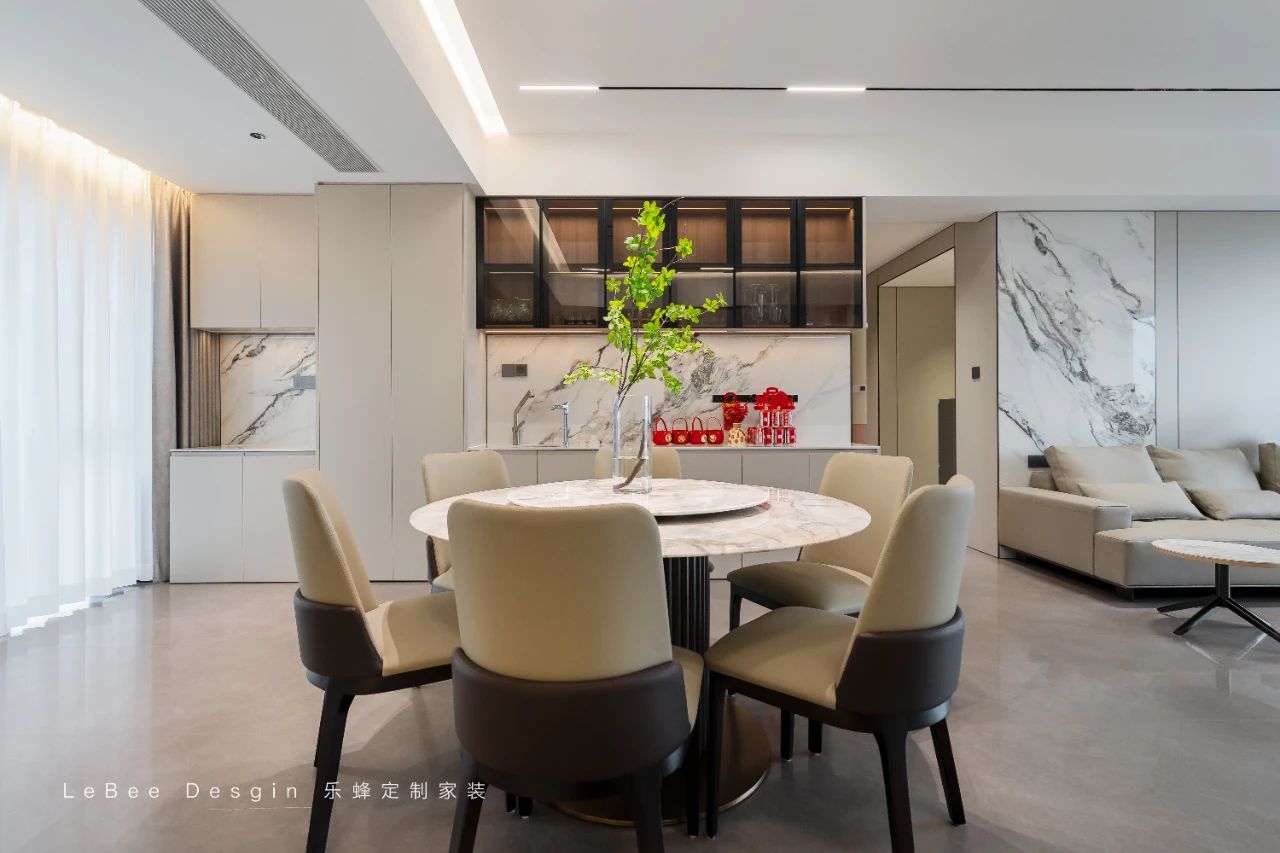 客廳一張巖板餐桌搭配著幾把簡(jiǎn)約的椅子,線條流暢,造型簡(jiǎn)潔。一家人圍坐在這里用餐,享受著溫馨的時(shí)光。上方的吊燈散發(fā)著柔和的光線,為用餐增添了一份浪漫的氛圍。