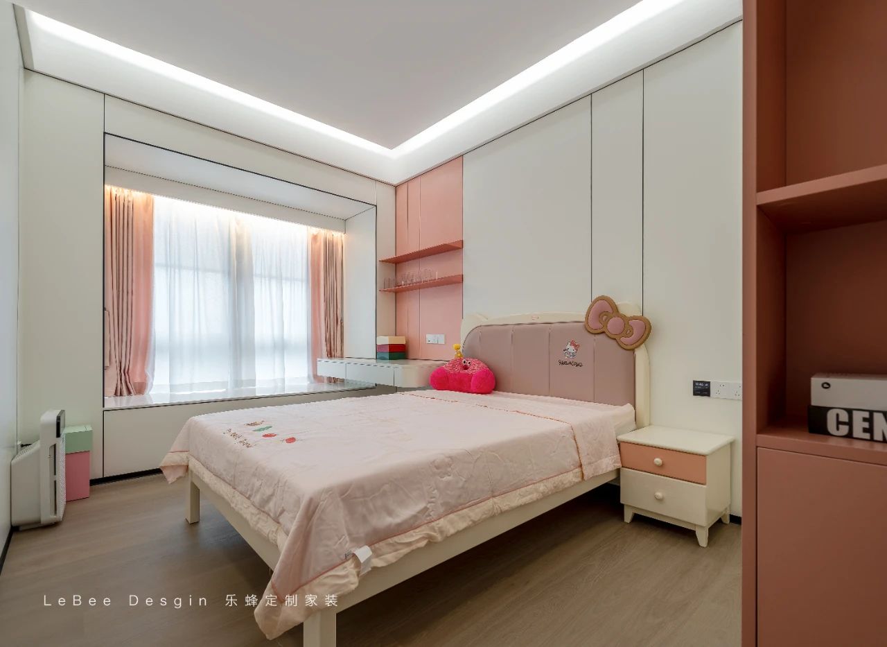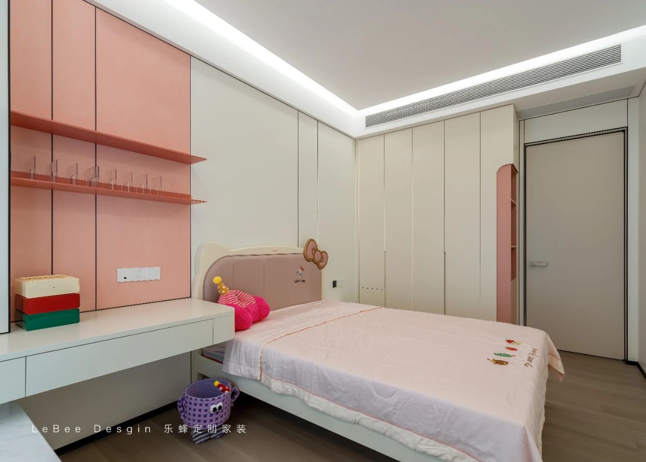 兒童房則延續(xù)了女孩房的設(shè)計(jì),沒有過多的設(shè)計(jì),有意思的是,床品背景做了造型設(shè)計(jì),讓整個(gè)空間顯得更加可愛溫馨。
