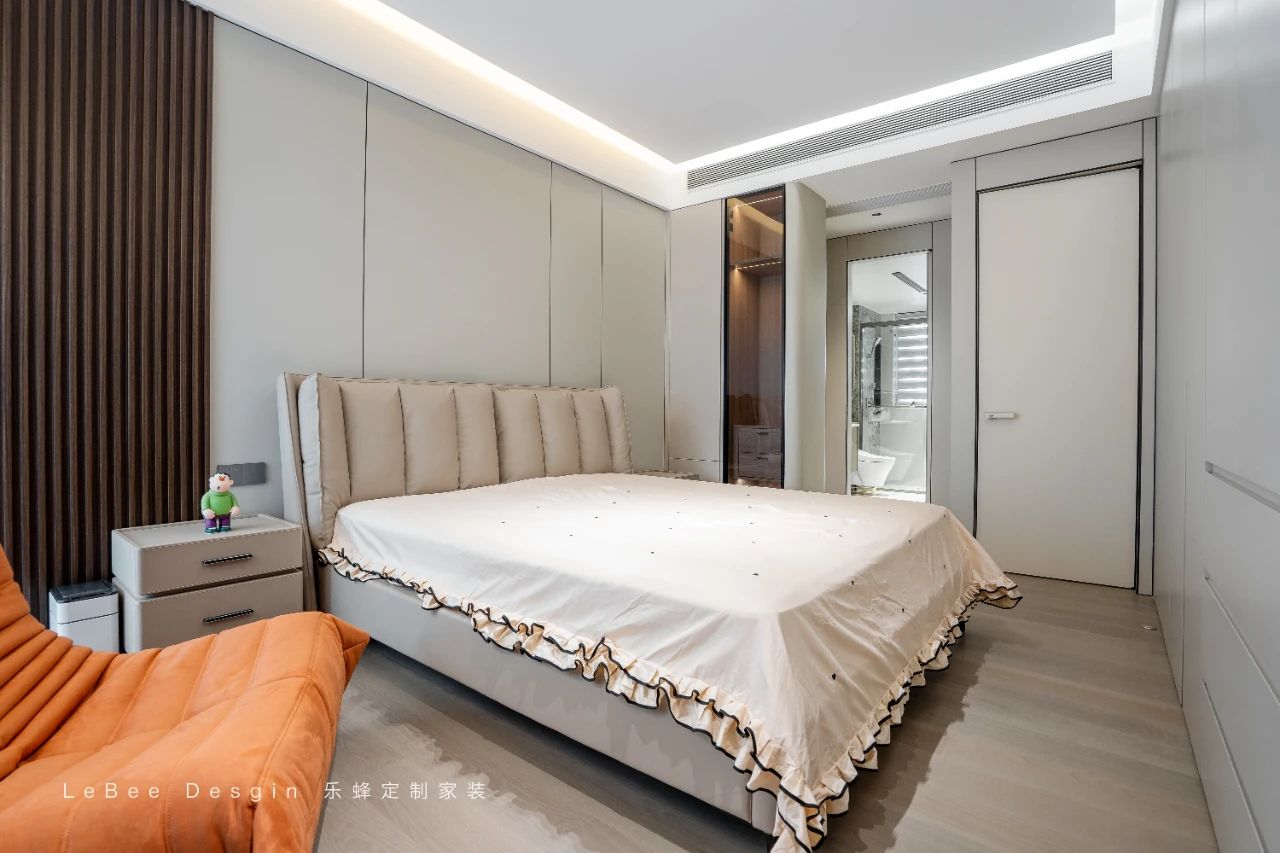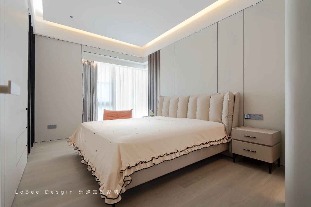 柔和的燈光從吊頂邊緣散發(fā)出來,營(yíng)造出溫馨而浪漫的氛圍,讓人在進(jìn)入房間的瞬間便能放松身心。